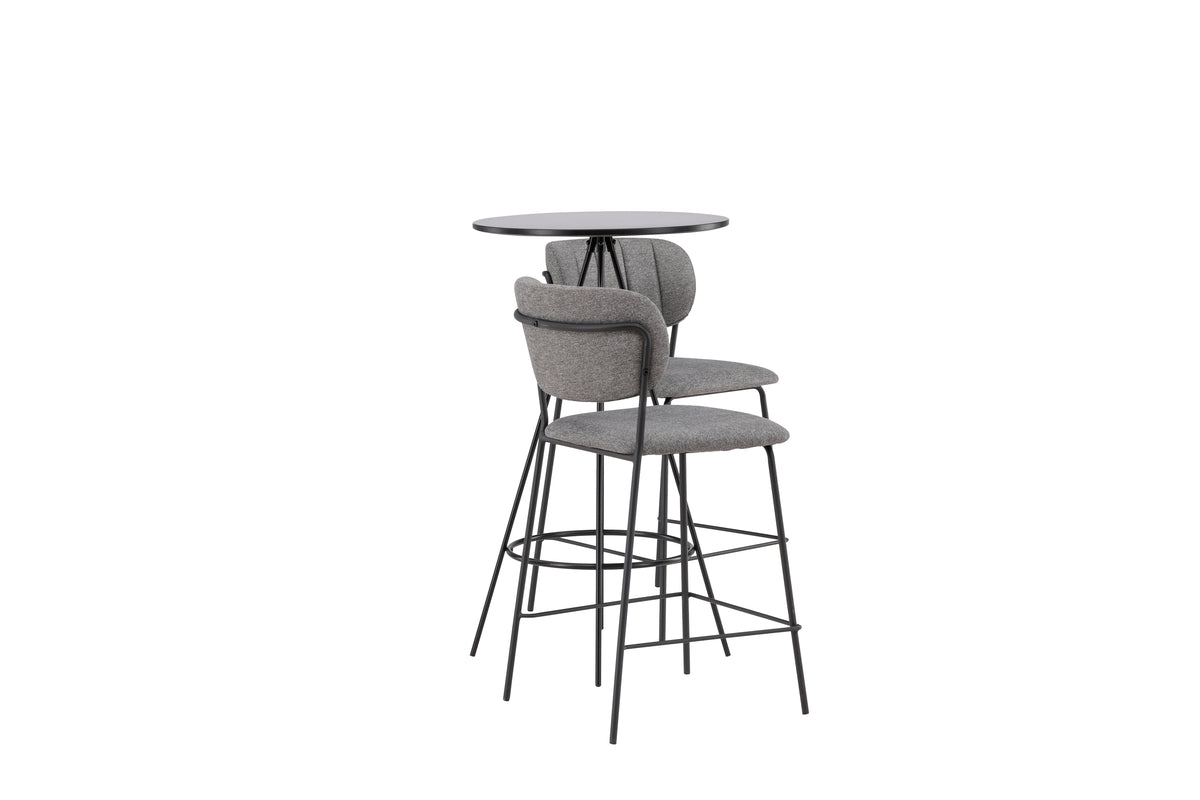 En charmig bargrupp i behagliga kulörer! Barbordet Bistro har en minimalistisk, Skandinavisk design med en rund bordsskiva i svart MDF med faner. De luftiga, konformade bordsbenen är lätt utsvängda i svart metall och har en integrerad ram till fotstöd. Här tillsammans med grå barstolar från serien Bell. Stolen har en helklädd design med lätt rundad rygg och sits i grått polyestertyg med snygga dekorsömmar och stolsbenen är smala i svart stål med integrerat fotstöd. Det smala utförandet ger ett luftigt intryck! Bordets mått: 60cm.