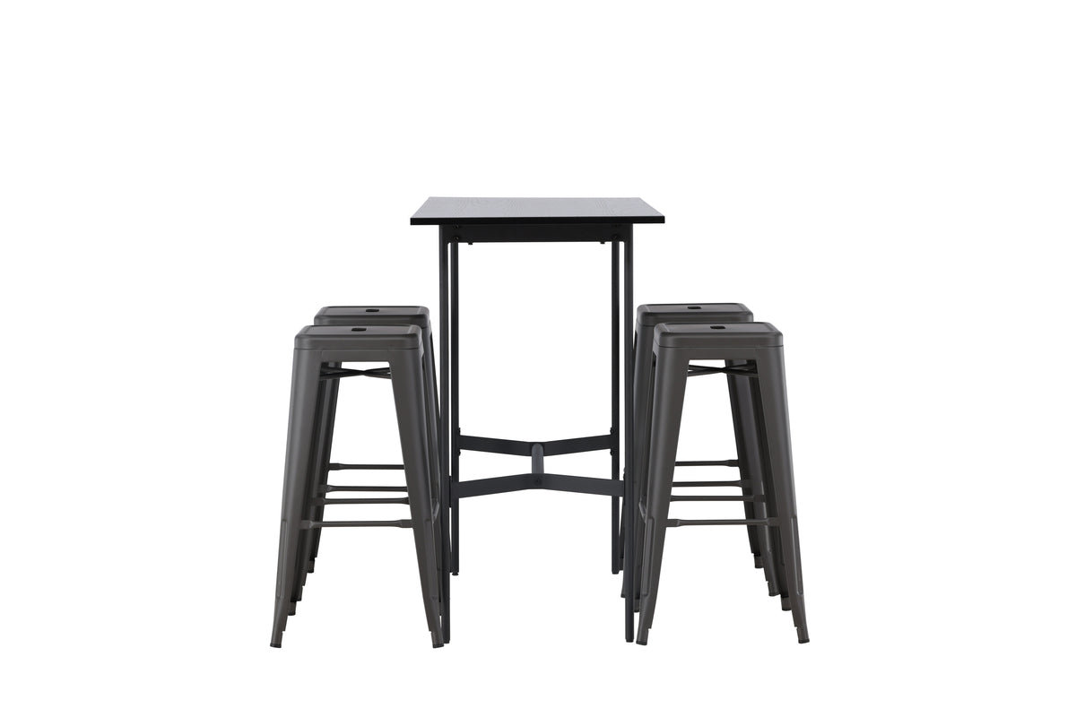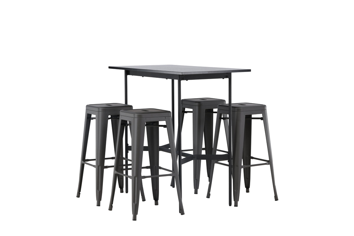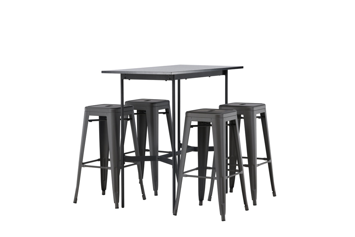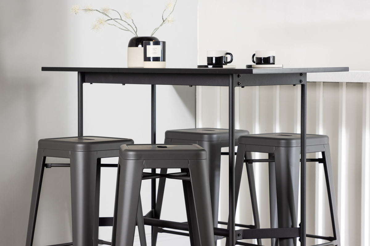 Kom upp på nya höjder! Det minimalistiska barbordet Rax har en tunn bordsskiva i svart MDF och smala bordsben med integrerat fotstöd i svart metall. Här i perfekt kombination med grå barstolar från serien Tempe. Stolen har en klassisk design av en högre pall med lätt utsvängda ben och sits i mörkgrått stål och en ram för fotstöd. Den här bargruppen är perfekt i både köket och vardagsrummet! Bordets mått: 120x60cm.