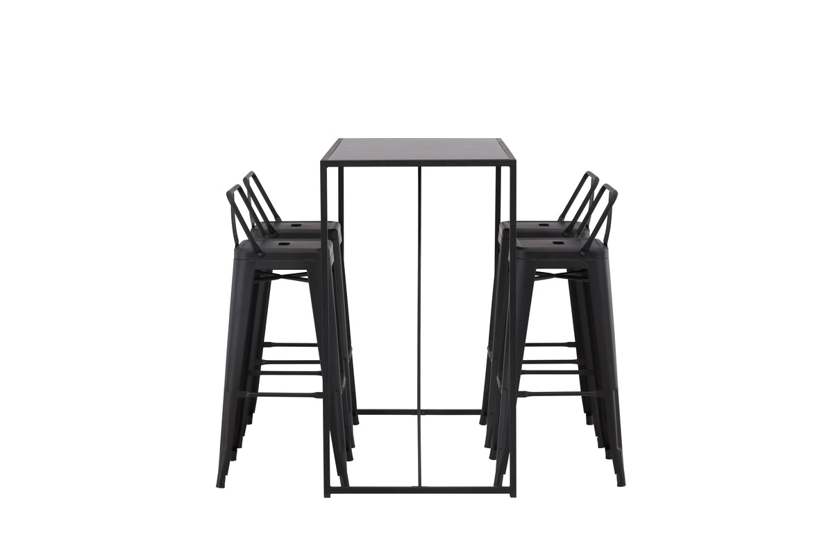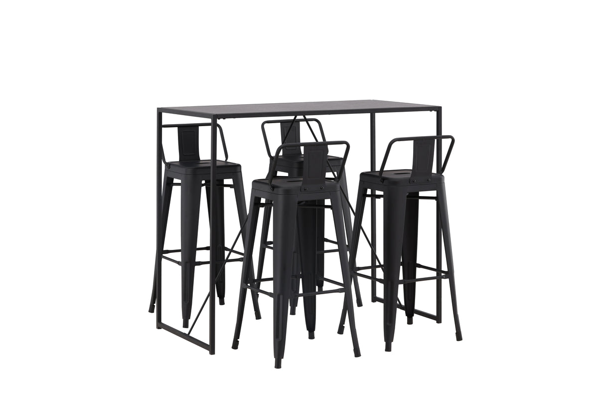 En stilren och trendig bargrupp för fyra! Här är barstolarna Tempe kombinerat med barbordet Brea som ger ett modernt och industriellt uttryck. Barstolen har en klassisk design av en högre pall med lätt utsvängda ben och sits med ett lägre ryggstöd i svart stål och en ram för fotstöd. Barbordet har en skandinavisk och minimalistisk design med en bordsskiva i tunn svart MDF med en smal ramkonstruktion i svart stål. Den här bargruppen är perfekt för dig som föredrar högre sittplatser i köket eller för dig med öppen planlösning som önskar sittande sällskap när du lagar mat.