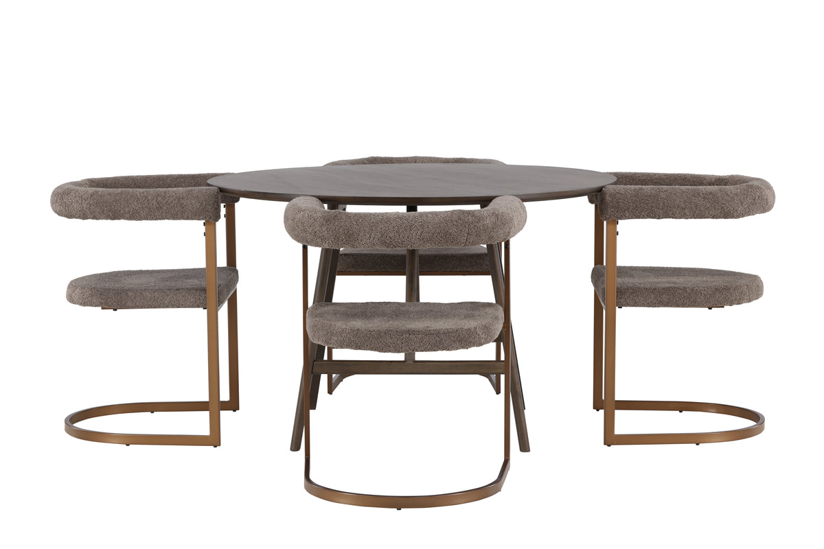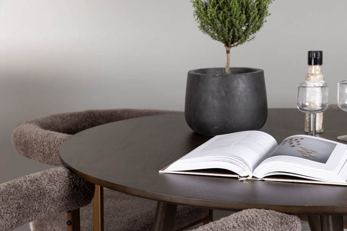 Skapa ett blickfång som imponerar med en genomtänkt, rund matgrupp i modern stil! Vårt runda matbord Kaseidon har en smakfull utformning med sin tunna toppskiva och lätt utsvängda ben, tillverkade av brun MDF och gummiträ. Den valnötsbruna kulören ger en jordnära och varm känsla till ditt hem. Bordets mått: 100cm. Här kompletteras matbordet med våra trendiga matstolar Morning. Stolen kombinerar komfort och enkel elegans på bästa sätt. Den rundade stolsryggen och den stoppade sitsen, klädd i grått boucle-tyg, ger en lyxig och inbjudande känsla. Ramkonstruktionen i brunt stål har en minimalistisk design som kompletterar bordet perfekt. Här kan du njuta av den perfekta kombinationen av stil, komfort och funktionalitet. Varför nöja sig med något mindre när du kan få allt du önskar i en och samma matgrupp? Det ska kännas både trivsamt och lyxigt att komma hem!