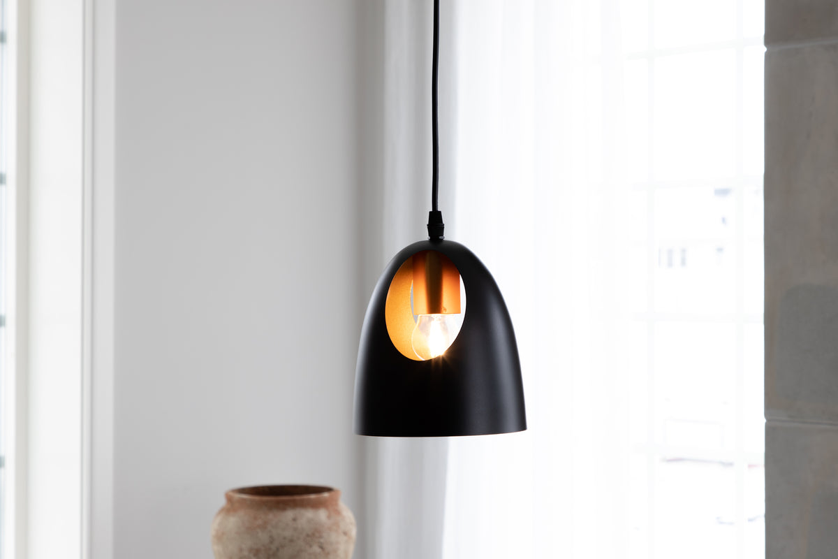 Med Elda taklampa får du ett unikt blickfång som imponerar! Med en lampskärm formad som en kupa och en kopparfärgad insida, tillför den här lampan en varm känsla i rummet. Placera lampan över matbordet, i vardagsrummet eller använd som fönsterlampa och du får inte bara belysning utan också en tuff inredningsdetalj på köpet.