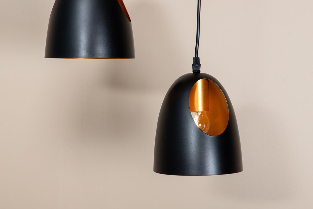 Med Elda taklampa får du ett unikt blickfång som imponerar! Med tre ljuskällor med lampskärmar formade som en kupa och en kopparfärgad insida, tillför den här lampan en varm känsla i rummet. Placera lampan över matbordet, i vardagsrummet eller använd som fönsterlampa och du får inte bara belysning utan också en tuff inredningsdetalj på köpet.