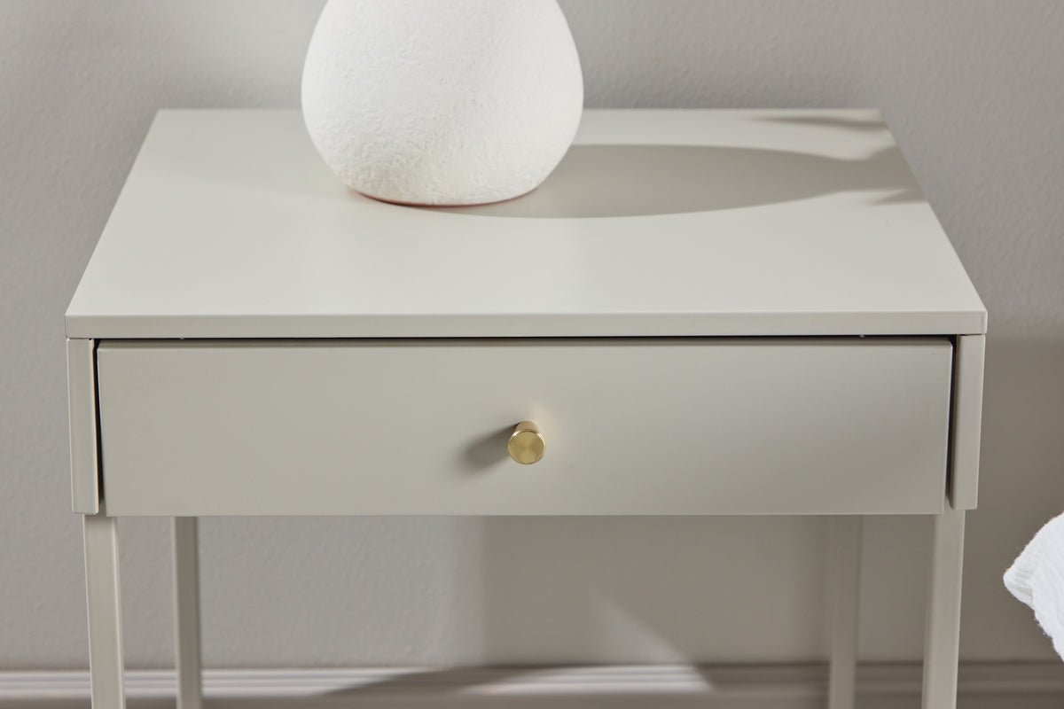 Bakal är ett elegant nattduksbord i en varm beige nyans som tillför mjukhet och harmoni till sovrummet. Med sin stilrena design passar det lika bra i moderna som klassiska inredningar. Den rymliga lådan erbjuder praktisk förvaring för allt du vill ha nära till hands – från böcker och glasögon till laddare och småsaker. Ovansidan ger gott om plats för lampa, väckarklocka eller dekorationer. Bakal är det perfekta valet för dig som söker ett nattduksbord som förenar form, färg och funktion.