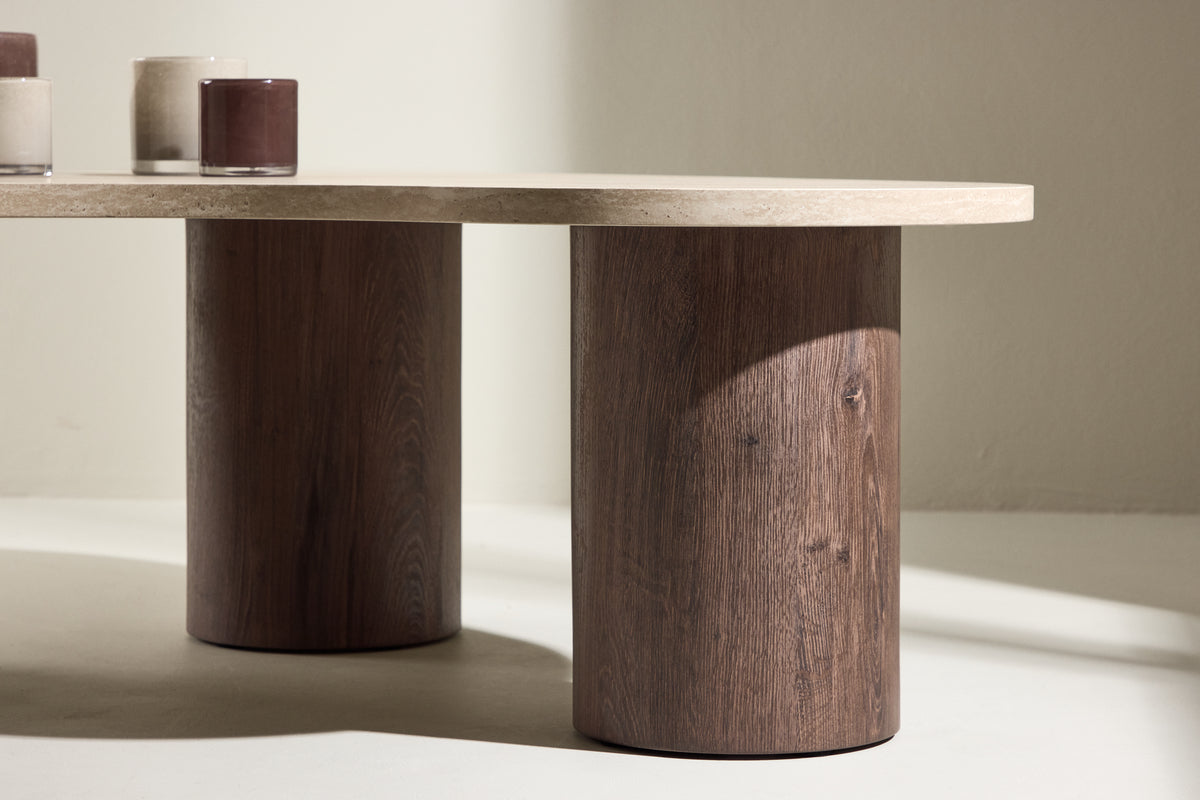 Soffbordet Megg är ett stilrent och modernt soffbord som kombinerar funktionalitet med tidlös design. Med sin eleganta ovala form och generösa mått på 130x78 cm skapar det en inbjudande yta som passar lika bra för avkopplande stunder som för att visa upp din personliga inredningsstil.Bordsskivan är tillverkad i MDF och har en sofistikerad beige yta som ger ett ljust och fräscht intryck. De robusta benen i en elegant moccafärg skapar en harmonisk kontrast och ger bordet en stabil och stilfull grund. Kombinationen av den ljusa bordsskivan och de mörka benen gör Megg till en mångsidig möbel som enkelt smälter in i både moderna och klassiska inredningar. Den ovala formen och de mjuka linjerna bidrar till ett varmt och inbjudande uttryck, samtidigt som bordets generösa storlek erbjuder gott om plats för vardagens behov – från kaffe och tidningar till dekorativa detaljer.Megg är det perfekta soffbordet för dig som vill ha en möbel som kombinerar praktisk funktion med elegant estetik. Låt det bli en naturlig mittpunkt i ditt vardagsrum, där design och komfort möts.