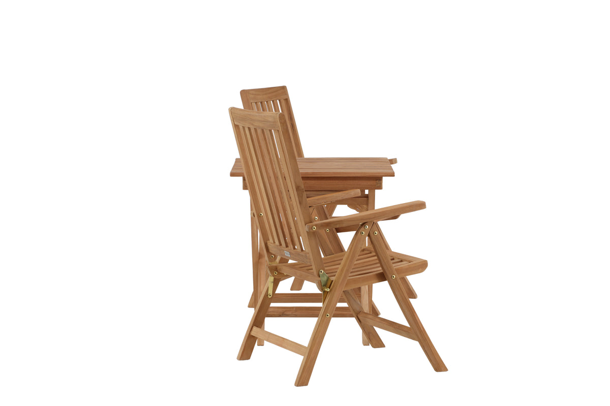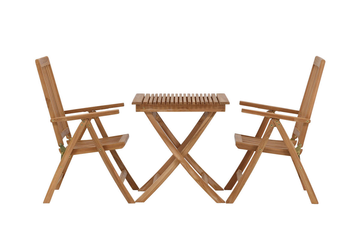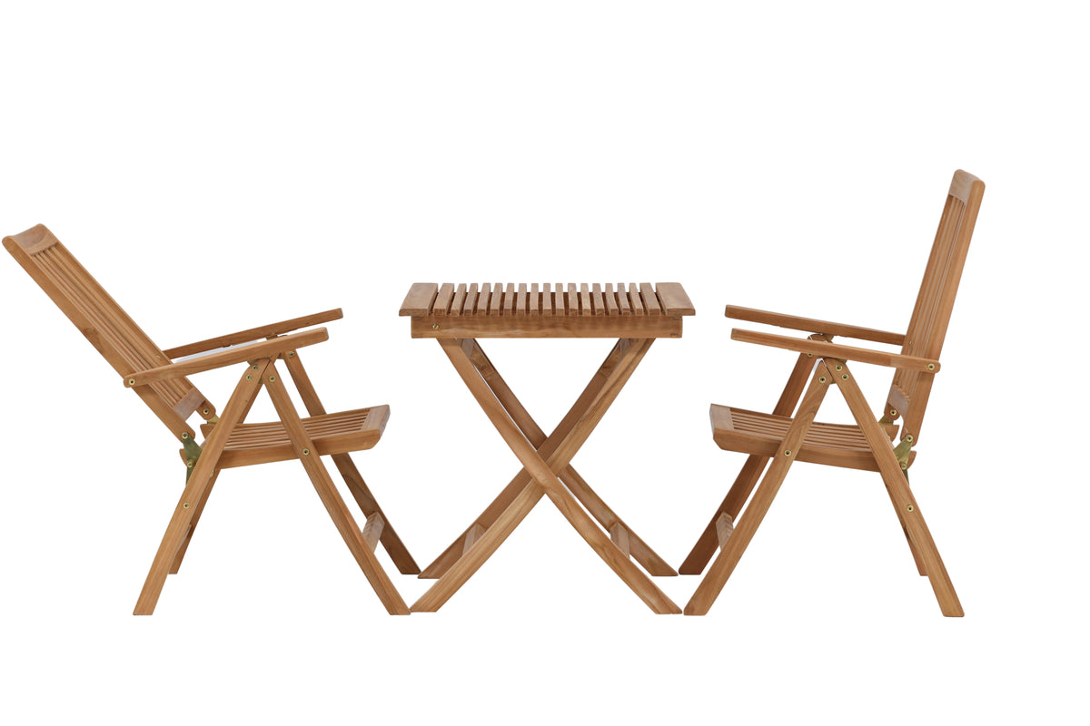 Lika tidlöst som modemedvetet - en matgrupp som imponerar! Matbord Ghana har en nätt design i vacker teak och är hopfällbart för praktisk förvaring och förflyttning. Här tillsammans med läckert matchande stolar från serien Kenya, också i smakfull teak. Stolarna är fällbara för optimal avkoppling och har armstöd för extra komfort. Det här är den perfekta cafégruppen för sommarens soliga fikastunder!