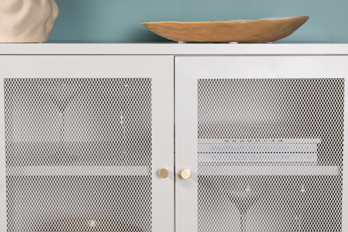 Malla - ett modernt skåp i en tuff industriell design med läckra nätdörrar och ben tillverkade i vit pulverlackerad stål med 2 smarta hyllplan för avlastning. Skåpet lyfts upp av smala, höga ben som skapar en luftig känsla och underlättar även för dammsugaren. Den perfekta förvaringsmöbeln för allt du önskar - fyll med porslin, böcker eller vackra dekorationer. Skåpets smidiga storlek och eleganta utsida gör den lättplacerad och passar bra in i de flesta rum i hemmet, så möblera efter egna behov och önskemål!