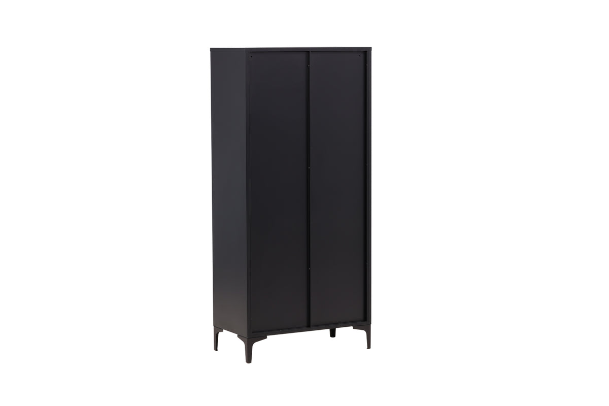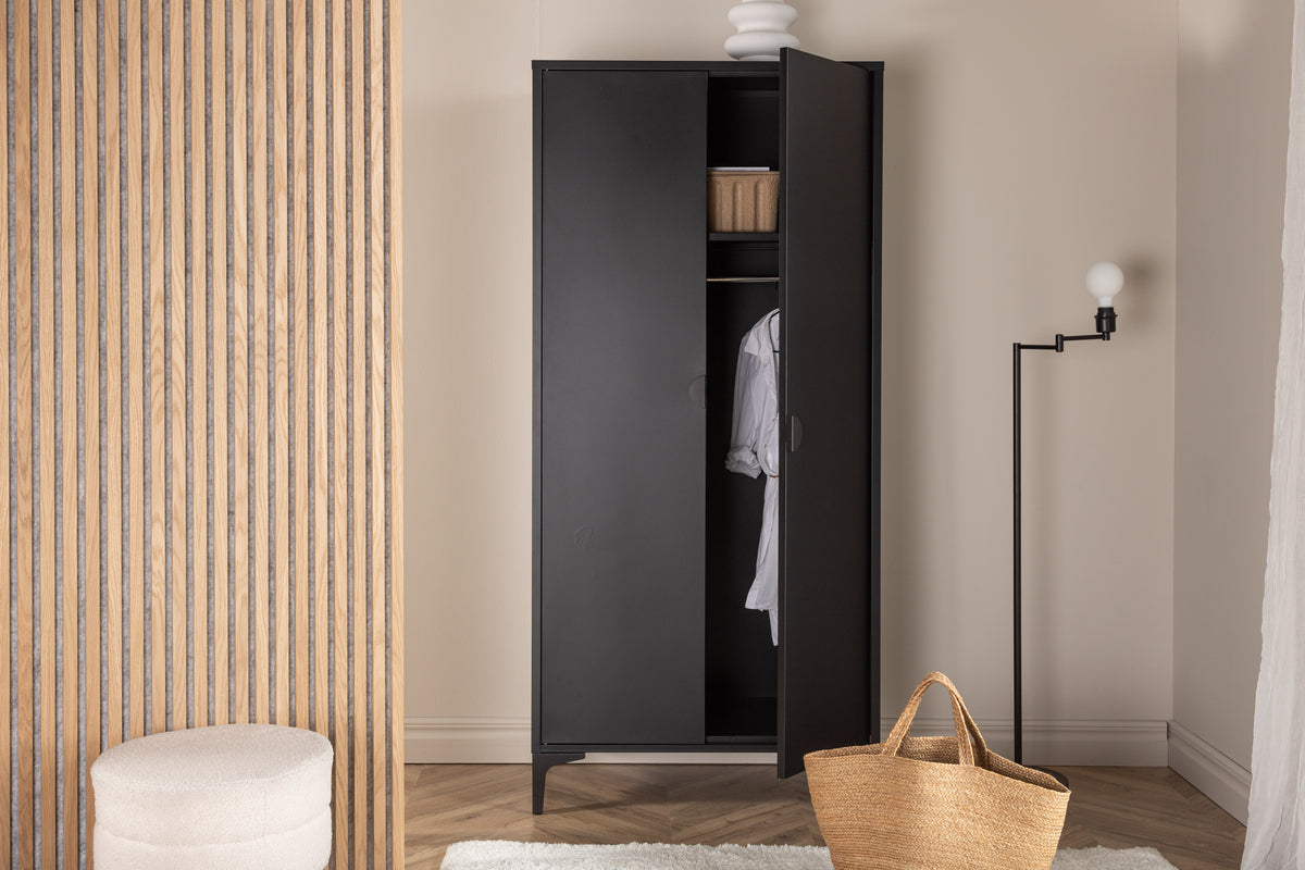 Kaxig och tidlös - Garderoben från serien Piring är det perfekta tillskottet till sovrummet! Den här höga garderoben i svart stål har två dörrar som öppnar upp till fyra hyllplan och rymmer även plats för hängare så att de nystrukna kläderna slipper skrynklas. Piring lyfts upp av fyra nätta ben som skapar ett luftigt intryck och underlättar också för dammsugaren. Investera i mer förvaringsyta till dig själv och få en snygg möbel i ditt hem på köpet!
