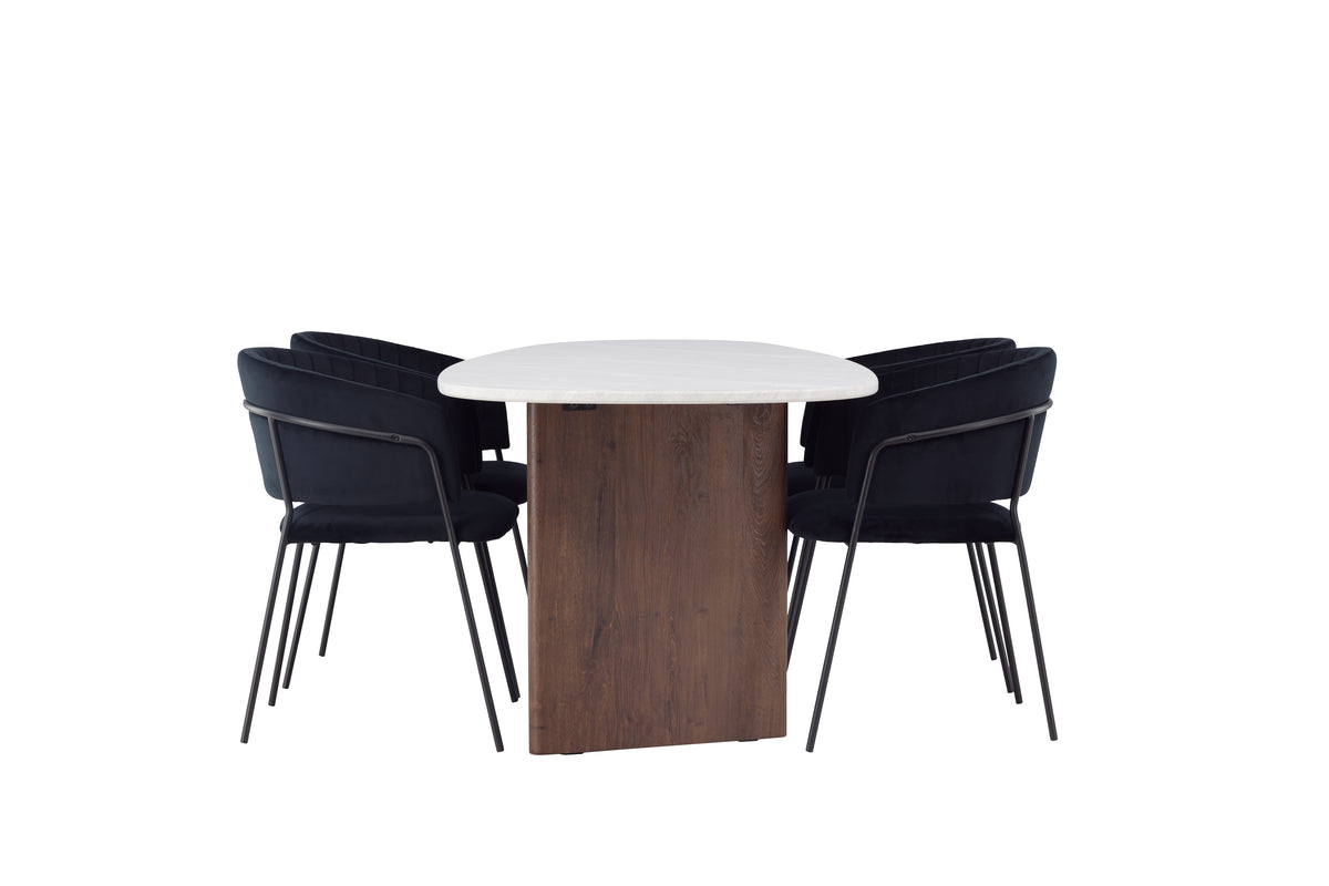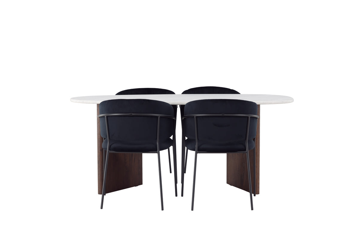 Låt oss presentera en magisk matgrupp som kombinerar stil med komfort på allra bästa sätt! Vårt ovala matbord Grönvik har en oregelbunden bordsskiva i ljusgrå MDF med marmor-look. Bordets stomme består av två tunna träskivor i en modern mörkbrun kulör som bär upp den vackra toppskivan. Dessa skapar en perfekt balans mellan elegans och naturlighet, vilket ger matgruppen en unik och exklusiv touch. Bordets mått: 180x75cm. För att göra matgruppen komplett har vi här matchat med de svarta matstolarna Selma. Ryggen är lätt rundad för optimal komfort, och sätet är klätt i ett lyxigt sammetstyg med dekorativa sömmar som ger en extra touch av elegans. Stolsbenen är smala och tillverkade i svart stål, vilket ger en modern och snygg kontrast till den mjuka sammetsklädseln. Det blir inte mer bekvämt än så! Ge ditt hem en touch av lyx och elegans med den här matgruppen och bjud hem nära och kära på trivsamma måltider framöver!