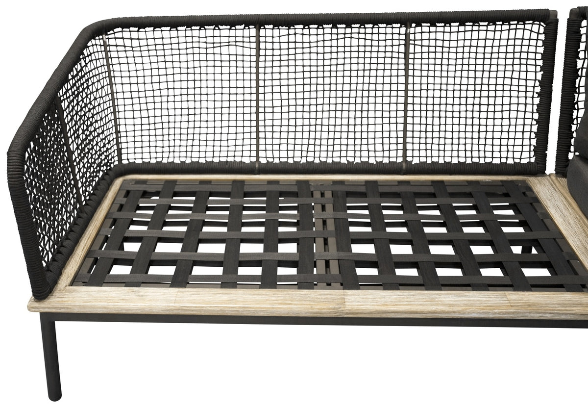 Andorra – En nätt och stilren soffgrupp i modern design. Soffgruppen består av en hörnsoffa tillverkad i en svart pulverlackerad metallram med stilfulla detaljer i akacia och en rygg i svart rep inklusive mjuka tjocka mörkgrå dynor, samt ett lågt stilrent soffbord med en bordsskiva i akacia och ett underrede i samma utförande som hörnsoffan. Tillsammans skapar de en vacker helhet! Skötselråd: För att dina utemöbler i Akacia/hårdträ ska bibehålla sin finish bör de oljebehandlas. Eftersom träslagen i sig inte är lika feta av naturen behöver de oljas lite då och då, även under säsong.