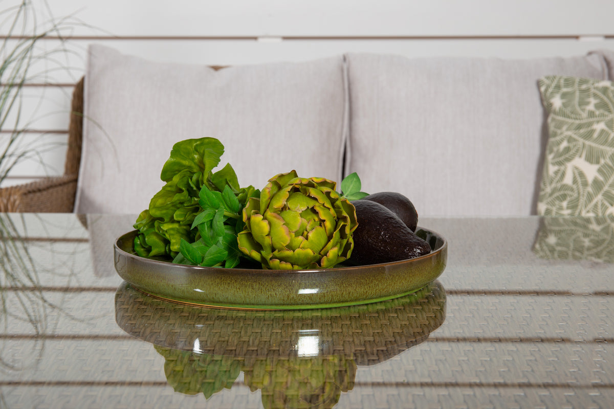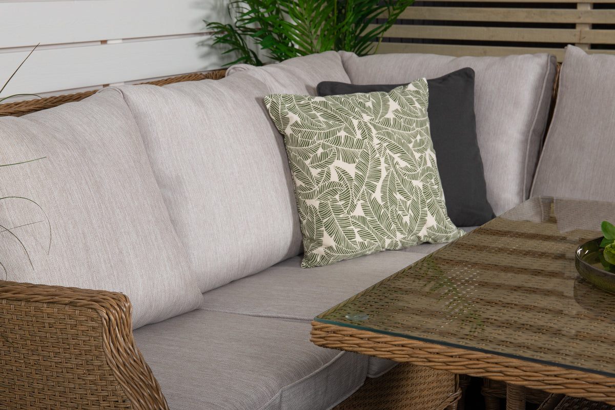 Soffgrupp Vikelund i klassisk design med fokus på en god komfort till din uteplats eller altan. Soffgruppen består av en hörnsoffa med fyra sittplatser och en hörndel. Till soffan tillkommer sandfärgade mjuka dynor samt ett högre soffbord med en avlastningshylla och en stilren bordsskiva av glas. Soffgruppen är tillverkad av en metallstomme och naturfärgad konstrotting - lika praktiskt som tåligt! Skötselråd: Konstrotting är ett plastmaterial som passar alldeles utmärkt för vårt skandinaviska klimat. Materialet är UV-beständigt och tåler väder och vind. Att det är UV-beständigt gör att möblerna inte bleknas, däremot rekommenderar vi alltid att förvara möblerna under ett möbelskydd eller på annat vis torrt och svalt – för att förlänga livslängden.