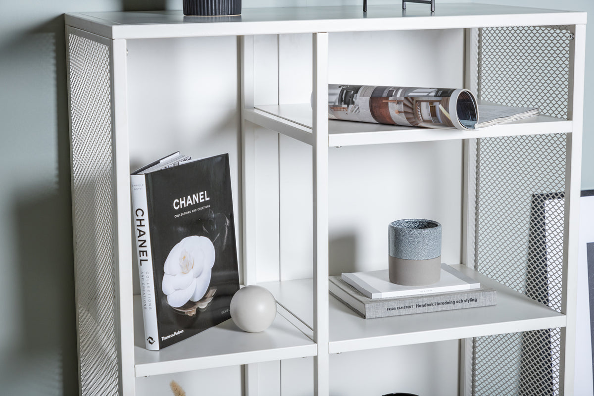 Misha, i tuff industriell design tillverkat i pulverlackerad vitt stål med tre avlastningsytor i olika höjder. Nät på sidorna av skåpet för en extra touch, vilandes på 4 pulverlackerade vita ben i stål. Mått: Längd: 80 cm, Bredd: 40 cm, Höjd: 110 cm. Lättare montering krävs.