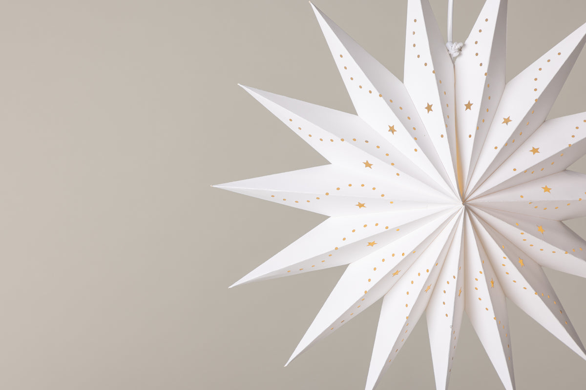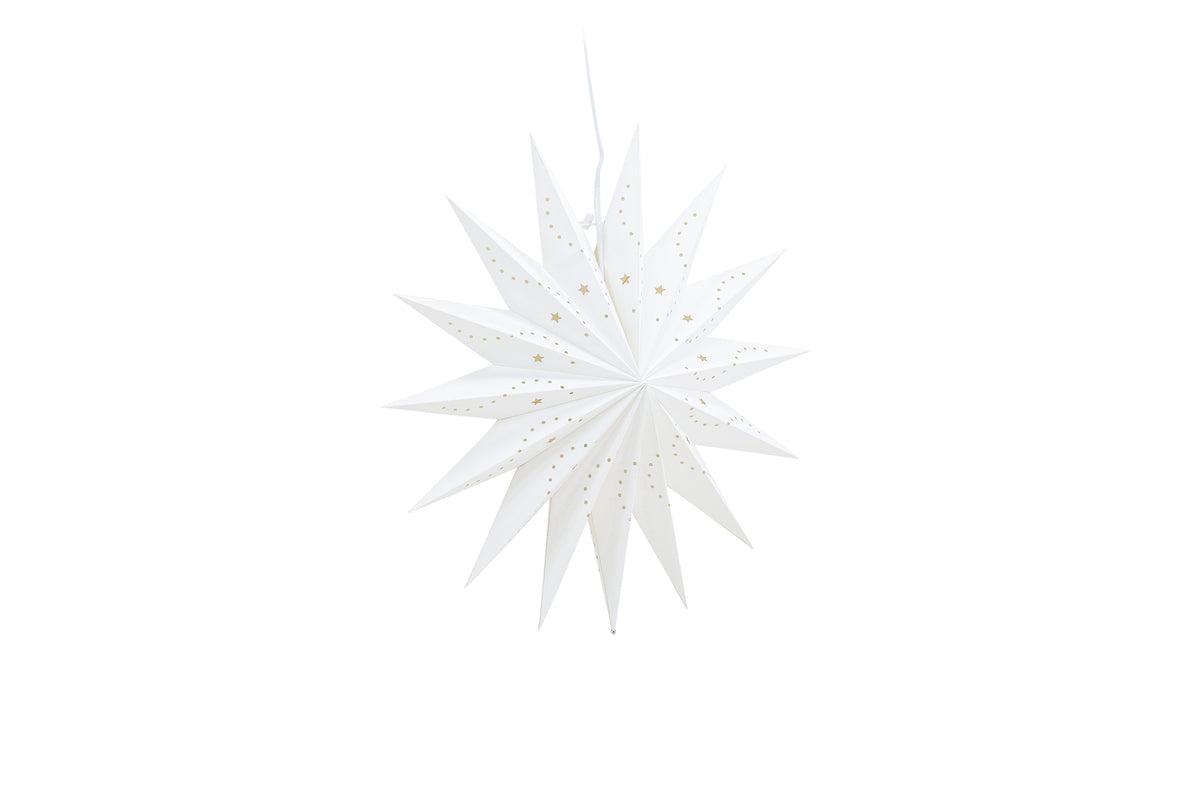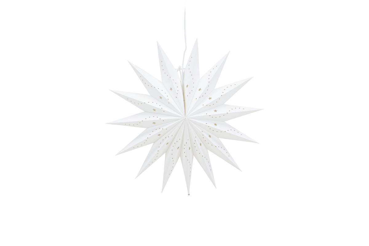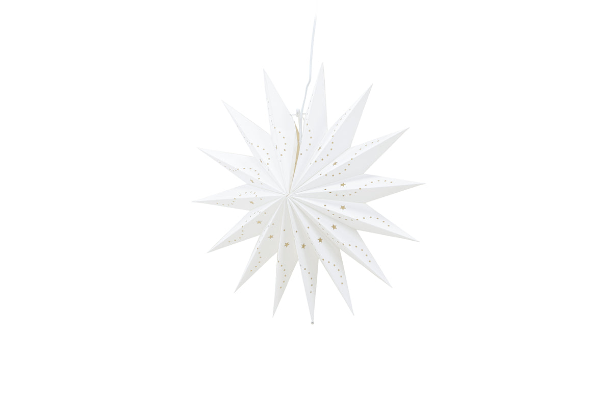 Vår vackra taklampa Lindvallen är den ultimata belysningslösningen för att skapa en mysig och stämningsfull atmosfär. Denna klassiska pappersstjärna i vitt papper med sina vackra hål i form av stjärnor och prickar släpper igenom ljuset på ett väldigt vackert sätt. Varje gång du tänder lampan Lindvallen kommer du att omedelbart känna hur den sprider ett varmt och mysigt sken i rummet. Den diskreta vita sladden smälter elegant in i helheten och bidrar till att skapa en stilren och sofistikerad belysningsanordning. Lindvallen passar perfekt för att lysa upp dina höstmörka dagar och för att skapa den perfekta atmosfären när julens högtidliga stämning kryper fram. Häng den i sovrummet för att skapa en lugn och avkopplande atmosfär, placera den i köksfönstret för att skapa en mysig stämning eller använd den inne i vardagsrummet för att ge rummet det där extra magiska touchen. Lindvallen finns i flera olika storlekar, vilket gör det möjligt för dig att välja den som passar bäst för ditt rum och stil. Varje storlek har sin egen charm och unika karaktär, men oavsett vilken du väljer kan du vara säker på att du får en belysningslösning som kommer att vara perfekt för just dig! Mått: 46cm.