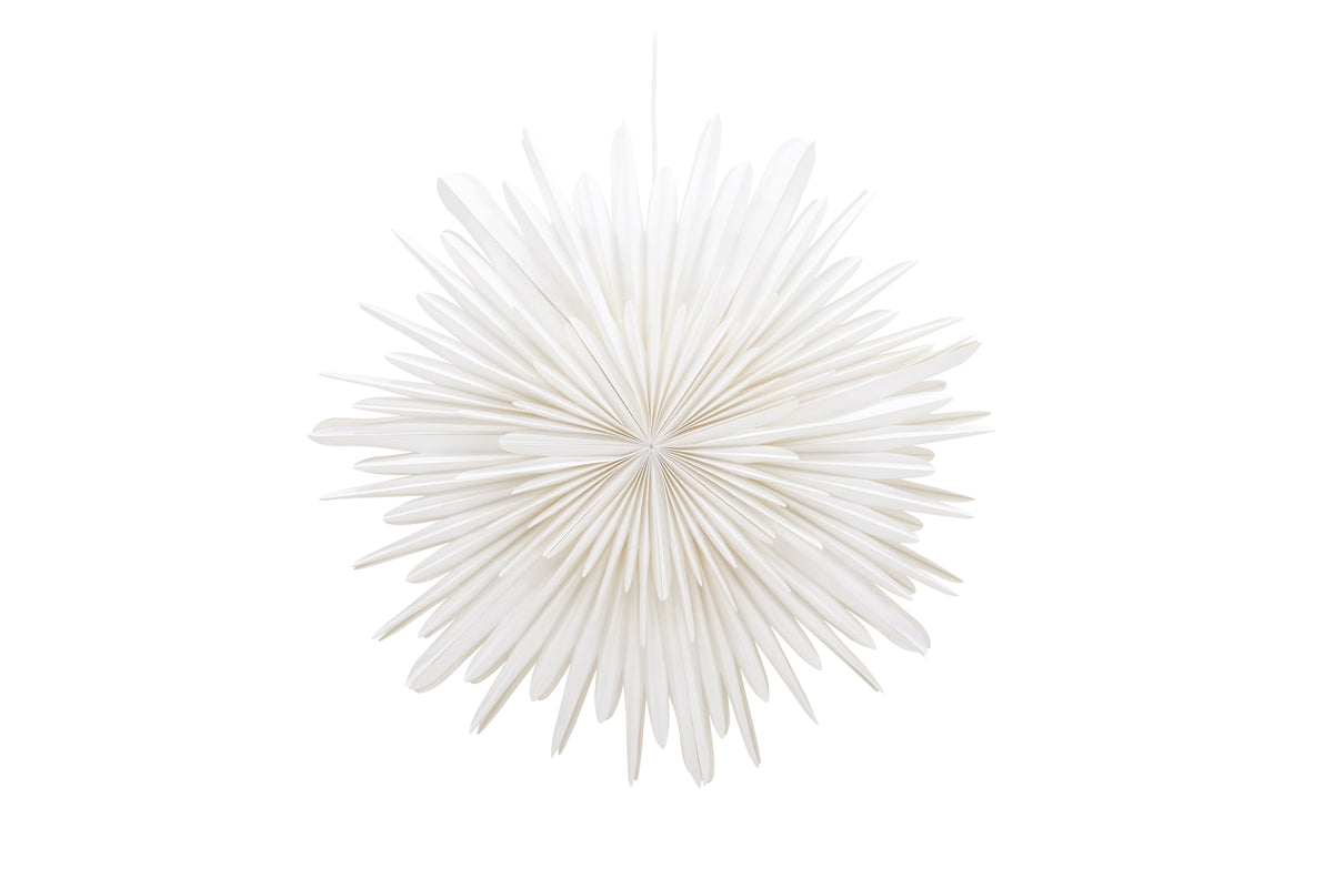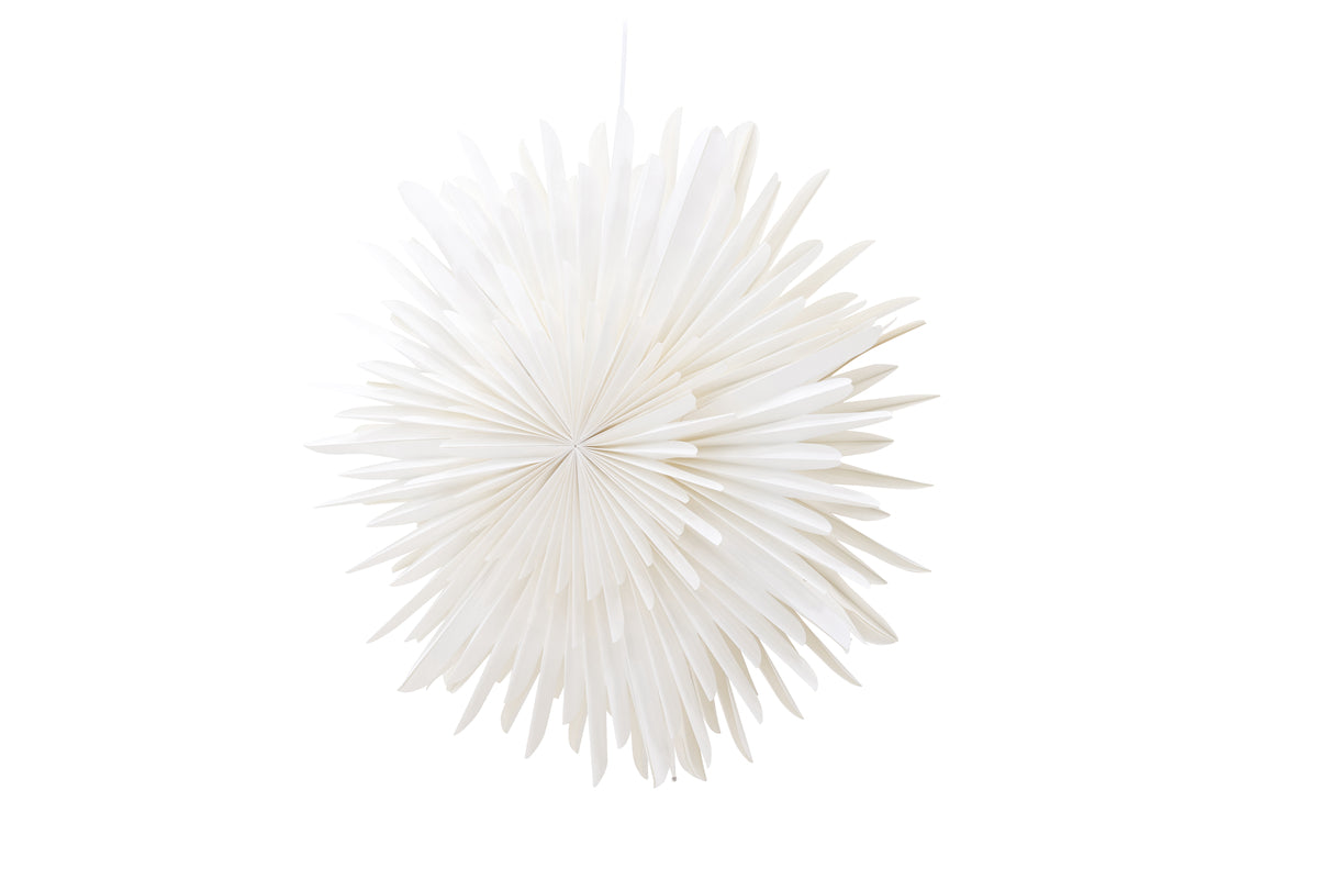 Denna vackra vita pappersstjärna är den perfekta belysningen för att skapa en personlig och mysig atmosfär i ditt hem! Oavsett om det är under höstens mystiska kvällar eller under julens festligheter, kommer taklampan från serien Sälen att sprida ett varmt och inbjudande sken som omedelbart kommer att förvandla ditt rum till en fridfull oas. Den här vita taklampan kommer i flera olika storlekar, så du kan välja den som passar perfekt för ditt utrymme. Häng den i köksfönstret, sovrummet eller vid soffgruppen för att sprida det charmiga ljuset som efterlängtas under mörka dagar. Lampans stjärnformade design erbjuder även flera praktiska fördelar. Tack varde den kan lampan sprida ljuset jämnt i alla riktningar och skapa en behaglig och mjuk belysning. Placera där den får mest kärlek och uppskattning och njut av dina favoritaktiviteter som läsning, pyssel eller bara att koppla av, i en atmosfär fylld av lugn och harmoni! Mått: 80cm.