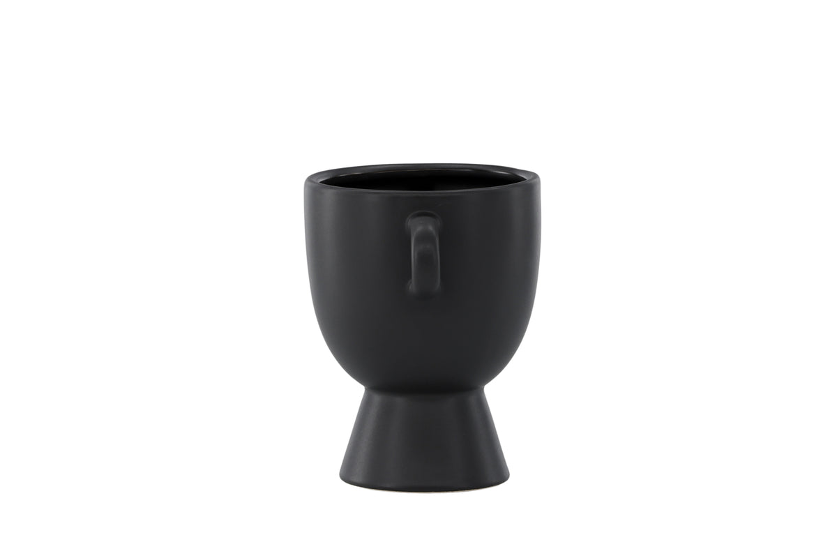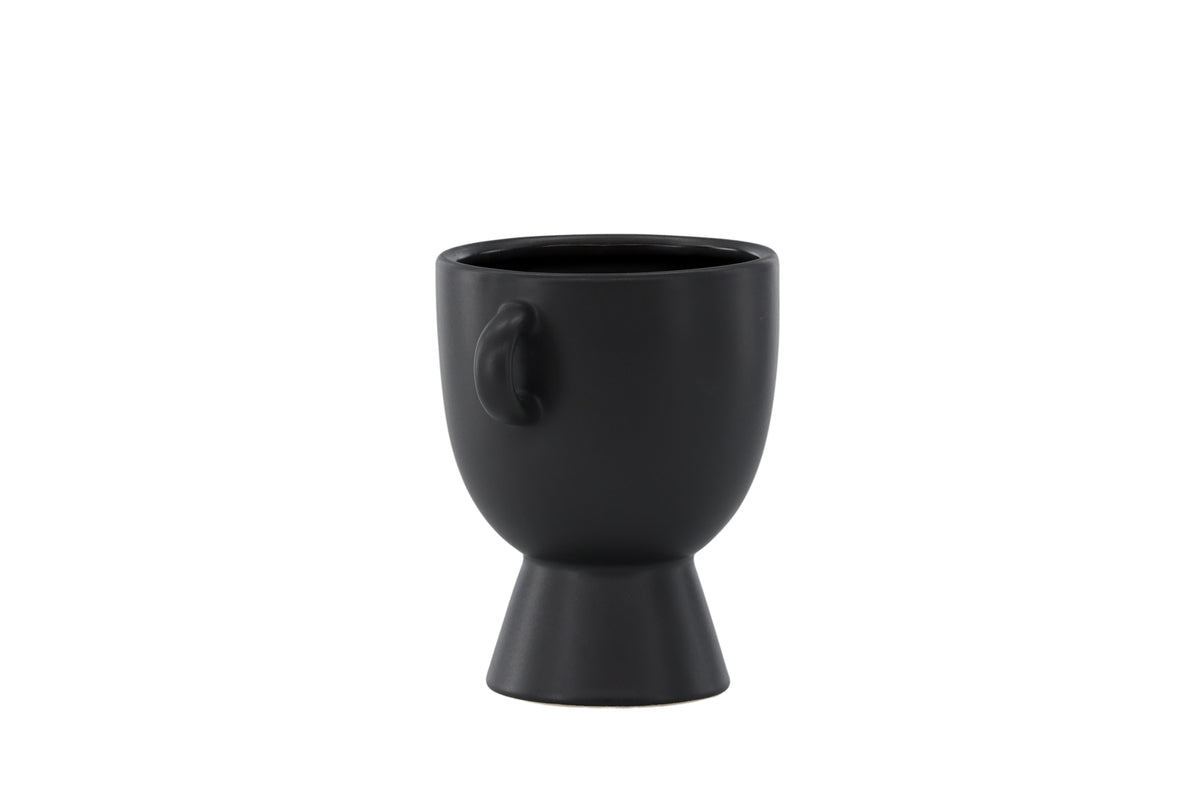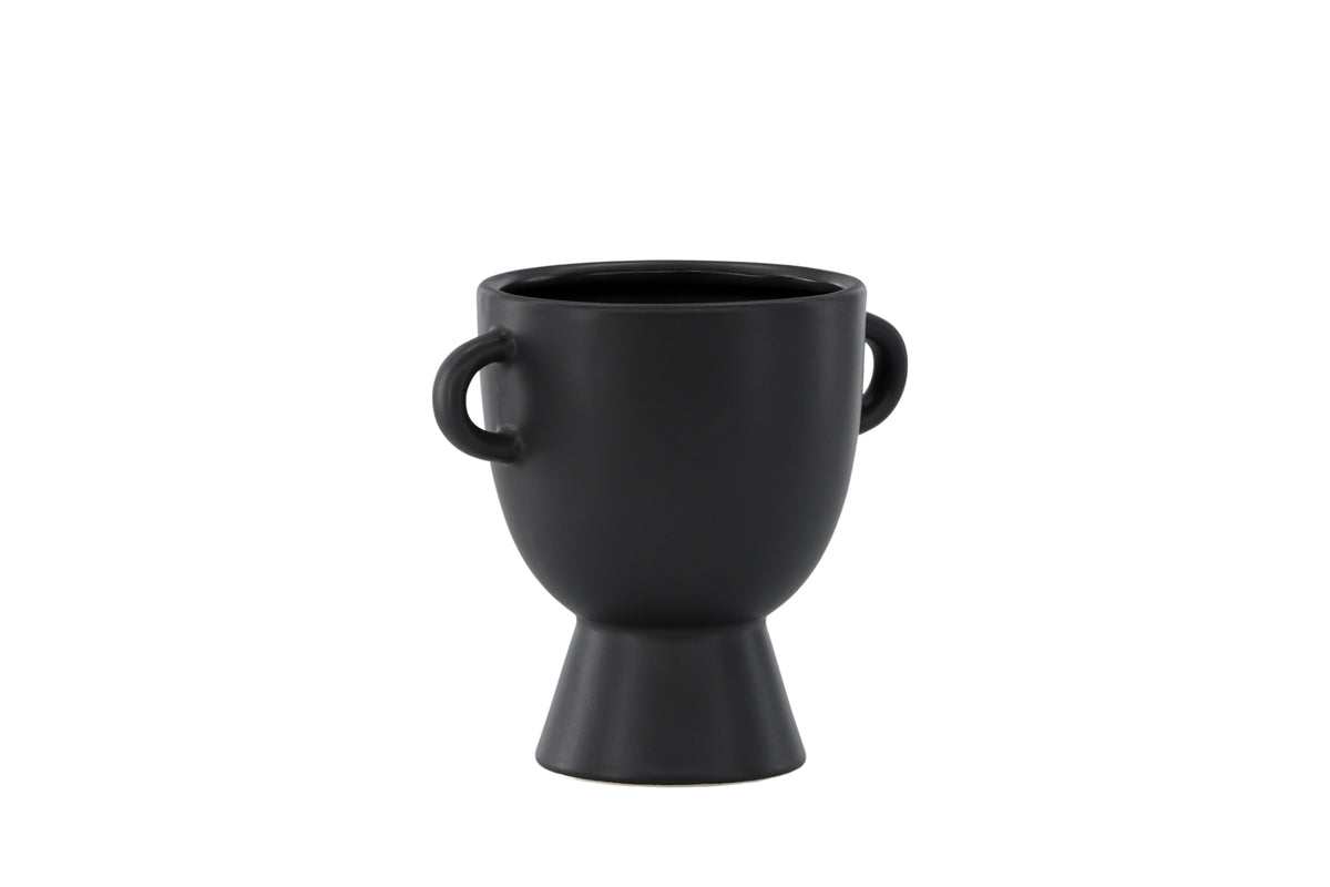 Upptäck skönheten och funktionaliteten hos Cent-serien, där varje kruka och vas är en unik konstnärlig skapelse. Välj din favorit bland de olika storlekarna och formerna. Cent-krukan, tillverkad i robust stengods och klädd i en elegant svart färg, är ett stilfullt tillskott till ditt hem. Med en höjd på 18cm och en rund form blir Cent-krukan en perfekt plats för dina växter eller blommor. Dess välbalanserade design inkluderar ett handtag på varje sida, vilket ger en extra detalj till krukan. För att addera extra höjd och elegans har Cent en fot, vilket ger den en lyftande effekt och framhäver dess unika design. Den här krukan är inte bara en praktisk behållare utan även en konstnärlig detalj som kommer att ge en touch av karaktär till ditt hem. Elegans möter funktionalitet med Cent-krukan – en del av en serie som kombinerar tidlös design med modern estetik. Utforska serien och låt Cent bli en central del av din inredning.