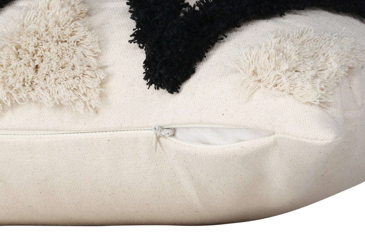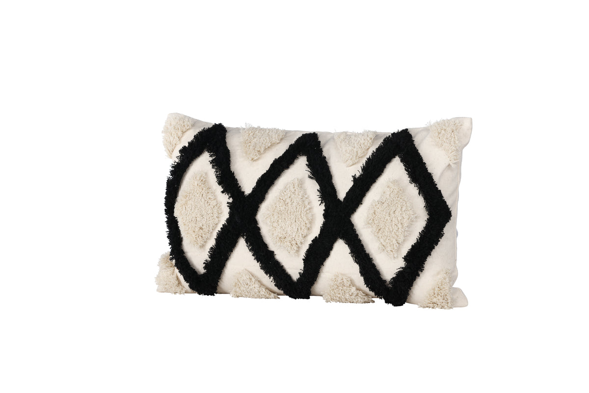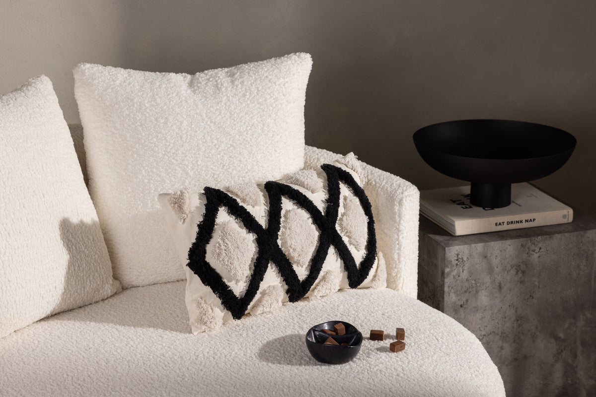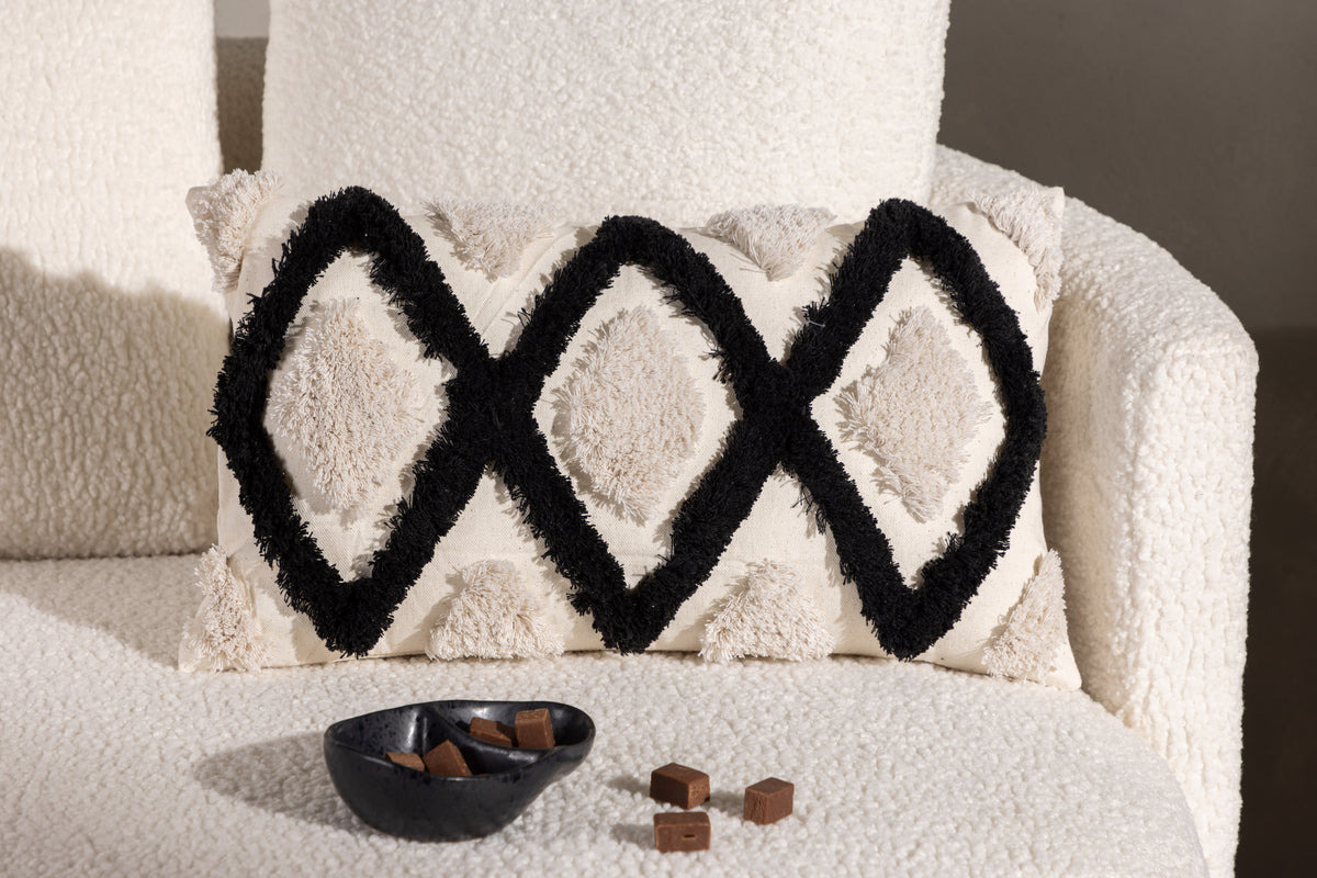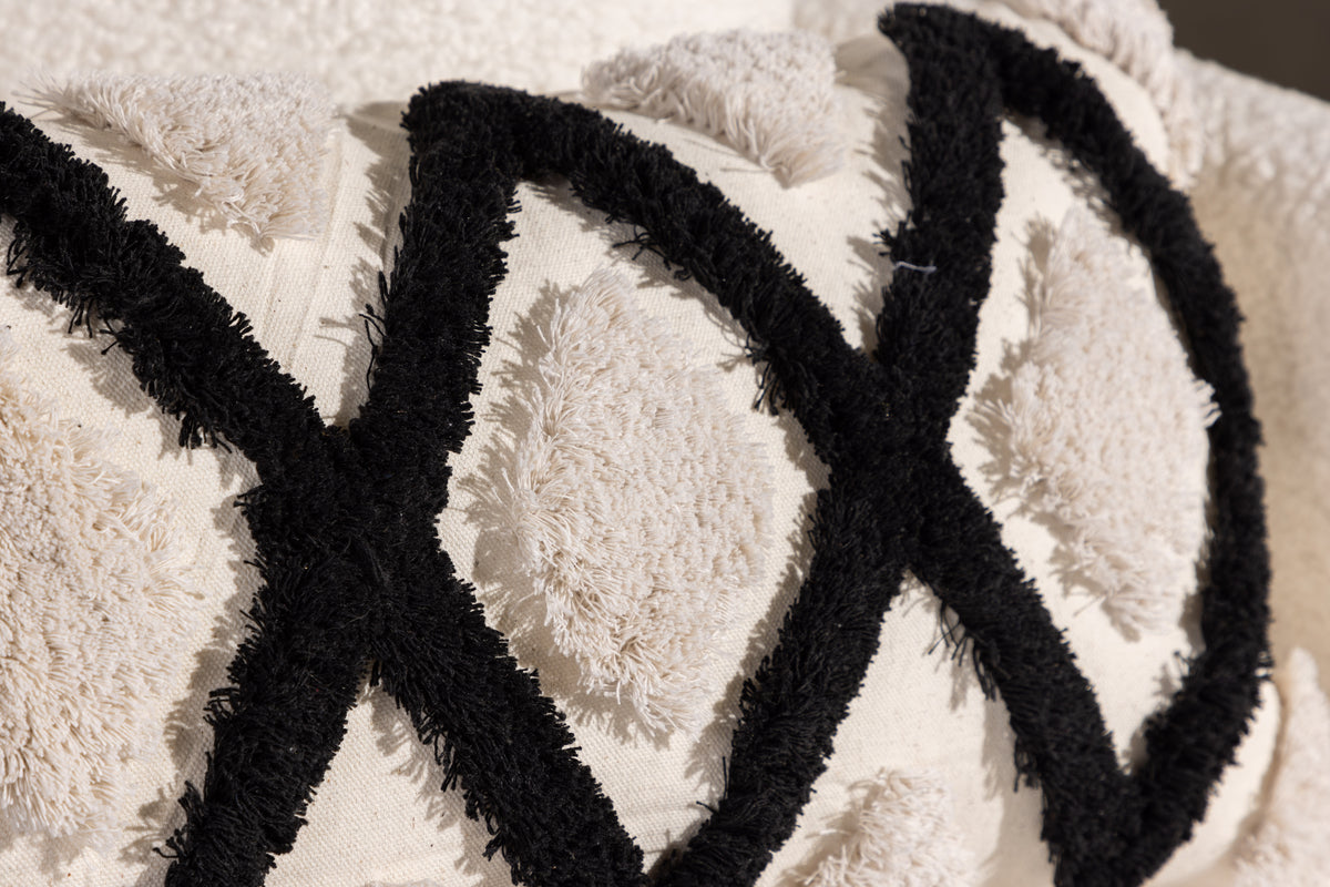 Emelie, vårt omtyckta kuddfodral som kombinerar komfort med moderna mönster! Det här avlånga kuddfodralet har en vit färgbas och ett abstrakt mönster i tuftat material i både vit och svart kulör. Tillverkat i en perfekt polyester- och bomullsblandning som är både följsamt och slitstarkt. Skapa ett snyggt blickfång i soffgruppen med en trendsäker kudde som enkelt går att matcha och kombinera med andra kuddfodral!