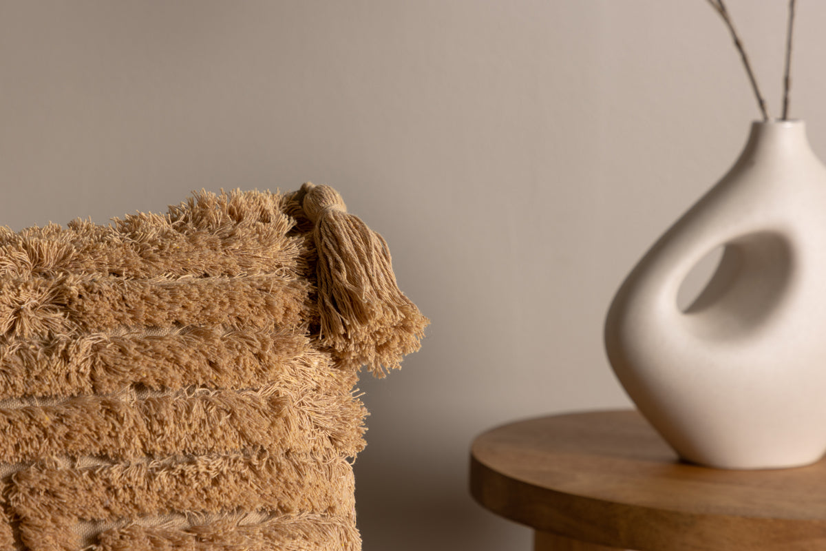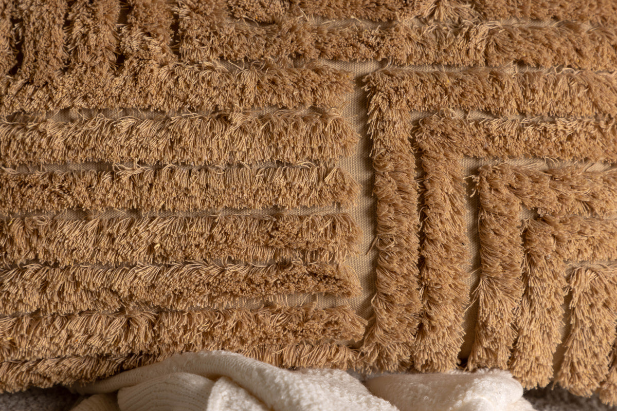 Idun, ett kuddfodral designat helt i linje med trenderna just nu! Det tuftade, abstrakta mönstret skapar en modern struktur till kudden och tofsarna i vardera hörn bidrar till ett lekfullt uttryck. Tillverkat i en slitstark polyester- och bomullsblandning som står sig över tid. Den genomgående ljusbruna kulören är enkel att matcha och kombinera med andra kuddar. Skapa ett snyggt blickfång i vardagsrummet!