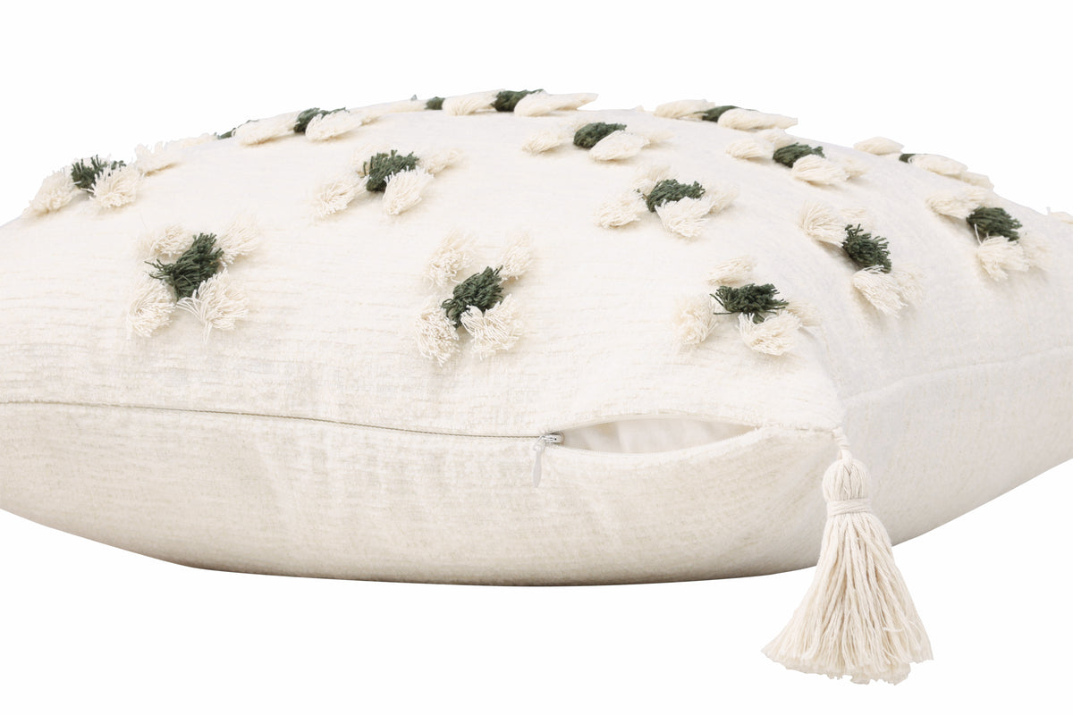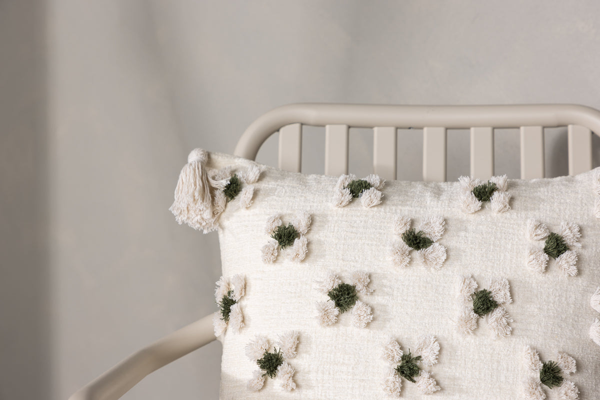 Pryd din soffa eller fåtölj med en snygg kudde från serien Millie i smickrande design! Det här kvadratiska kuddfodralet i vit baskulör har ett charmigt blommönster i tuftat grönt och vitt tyg som ger läcker struktur till kudden. Med vita tofsar i vardera hörn får kudden ett nostalgiskt uttryck och det finns en dold dragkjedja nertill. Tyget är polychenille vilket bidrar till en smakfull och slitstark textur. Värm upp atmosfären i rummet med hemtrevliga kuddar!