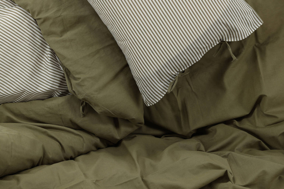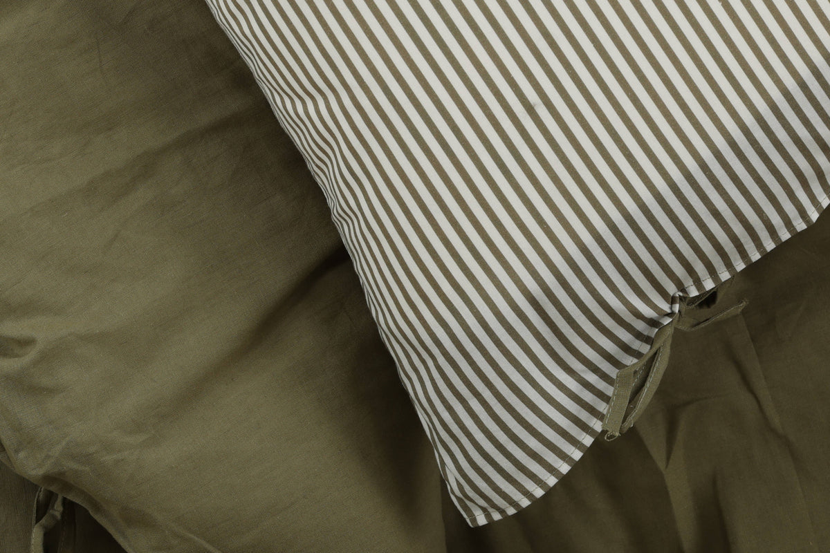 Bädda sängen snyggt och inbjudande med Jenna säng set i smäcker grön kulör! Lika praktiskt som snyggt erbjuder detta påslakanset två alternativa bäddningar då ena sidan har ett randigt mönster i vitt och grönt och den andra är stilrent enfärgad. Påslakan och örgott försluts med dekorativa snörningar för en mer romantisk look. Tillverkat i slitstarkt bomull och linné som är både luftigt och mjukt för kroppen att sova i. Mått: 150x200 cm.