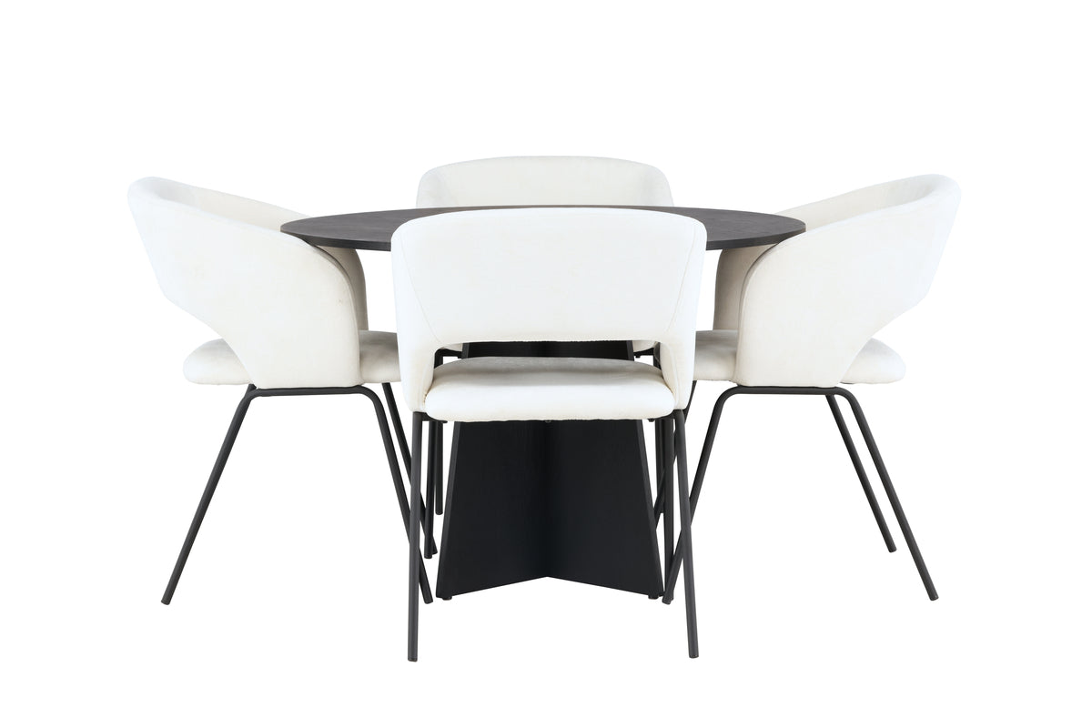 Skapa en modemedveten atmosfär i ditt hem med en rund matgrupp! Här välkomnas du hem till en myisg och inbjudande känsla. Vårt runda matbord Bootcut är designrikt med en bordsskiva i svart MDF med faner och en stadig stomme i samma material. Dess smarta storlek gör det till en idealisk plats för måltider och social samvaro, där ingen hamnar på kanten. Bordets mått: 110cm. Här kombineras Bootcut-bordet med våra underbara matstolar från serien Day. Dessa stolar kombinerar genomtänkt design, mjuka former och en minimalistisk struktur för att skapa en perfekt sittupplevelse. Med en helklädd sits och ett öppet ryggslut erbjuder Day-stolarna enastående komfort samtidigt som de utstrålar en modern och lyxig stil. Day-stolarna är klädda i elegant vitt linnetyg och de smala stolsbenen i svart stål ger en elegant kontrast som förstärker stolarnas stilrena utseende. Med dessa stolar kommer du att höja stilnivån i ditt hem och skapa en inbjudande atmosfär som imponerar på både familj och vänner. Här får du verkligen en perfekt kombination av stil och komfort!