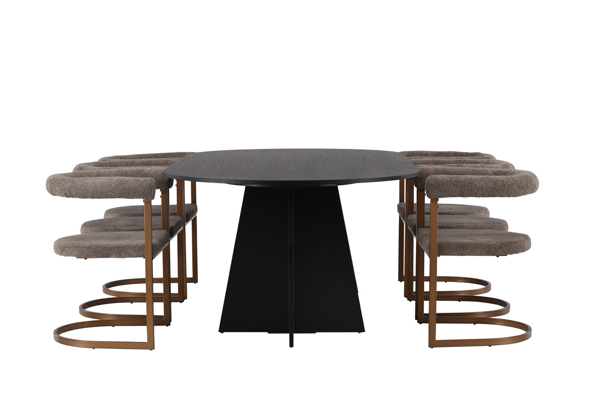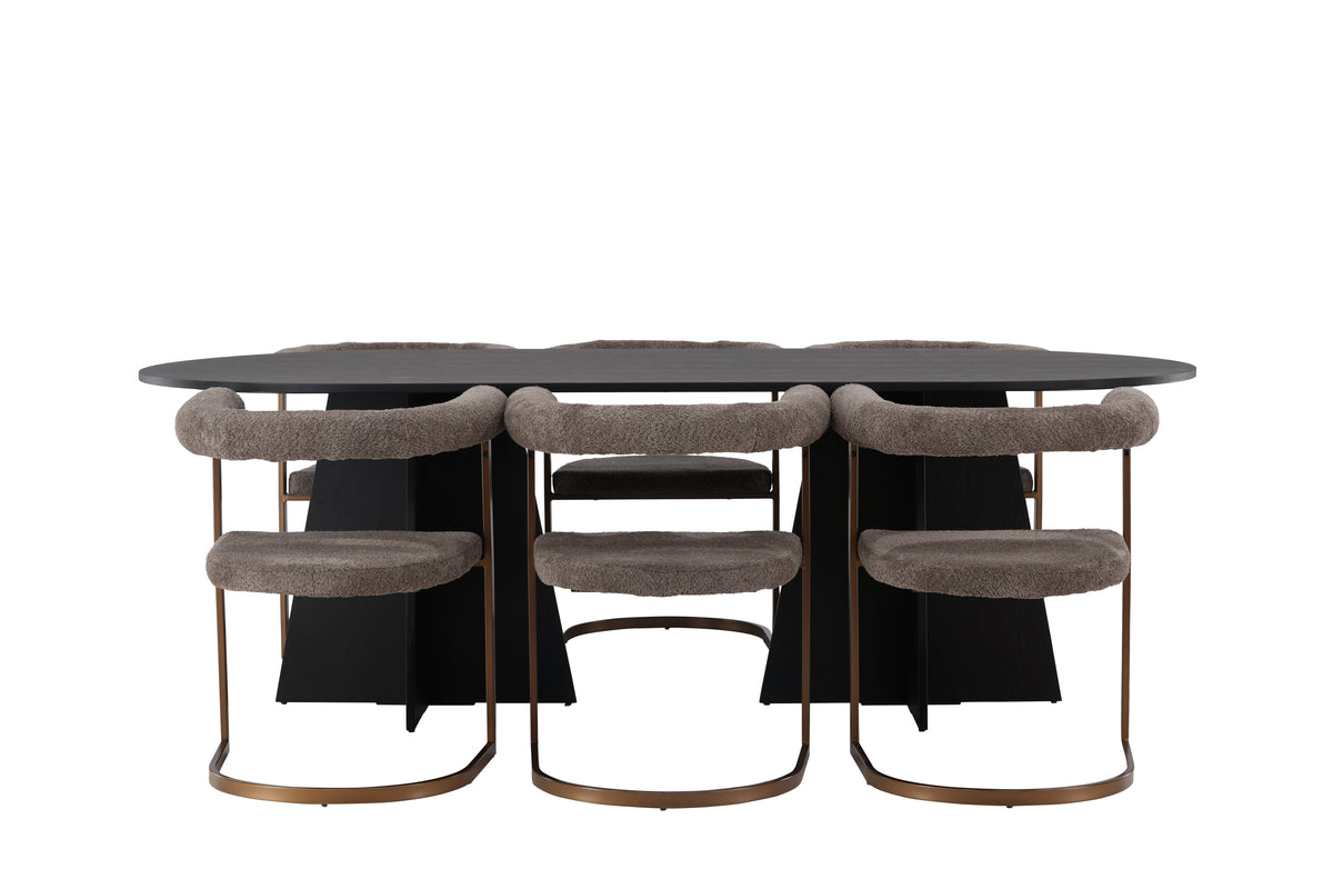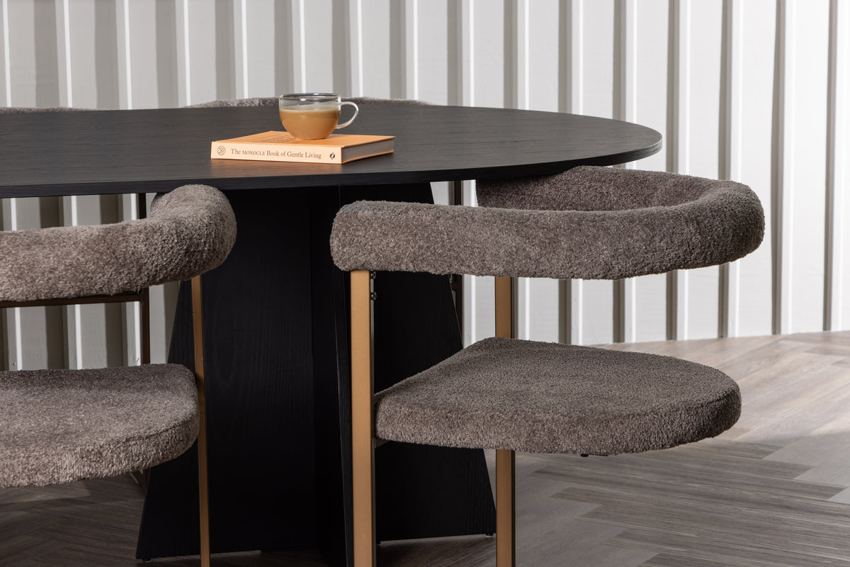 Välkomnas hem till en pampig känsla av lyx och modemedvetenhet. Den här matgruppen i skandinavisk stil kommer garanterat bli en ny favorit i hemmets hjärta! Vårt ovala matbord från serien Bootcut har en minimalistisk oval bordsskiva i svart MDF med faner, vilket ger en snygg kontrast till den distinkta stommen. Två konformade ben i öppen design ger inte bara stabilitet utan också ett visuellt intryck av design och noggrannhet. Bordets mått: 115x230cm. Tillsammans med våra moderna matstolar från serien Morning blir den här matgruppen komplett. Med sin rundade stolsrygg och stoppade sits i svart boucle-tyg erbjuder dessa stolar en fantastisk bekvämlighet. Den minimalistiska svarta stålramen ger en snygg kontrast till tyget och ger stolarna en modern touch. I den här svarta matgruppen är varje detalj noggrant utvald för att ge en känsla av exklusivitet och för att passa perfekt in i moderna hemmiljöer. Skapa ett pampigt blickfång som både känns trendsäkert och som står sig över tid!
