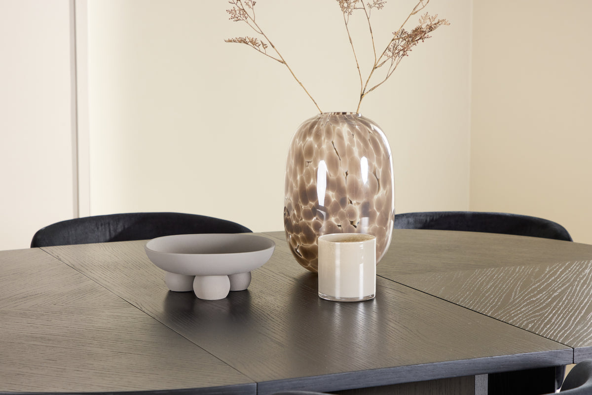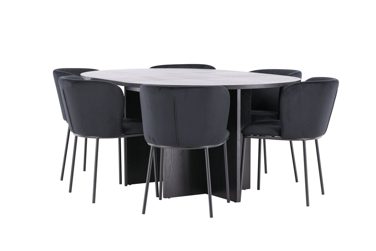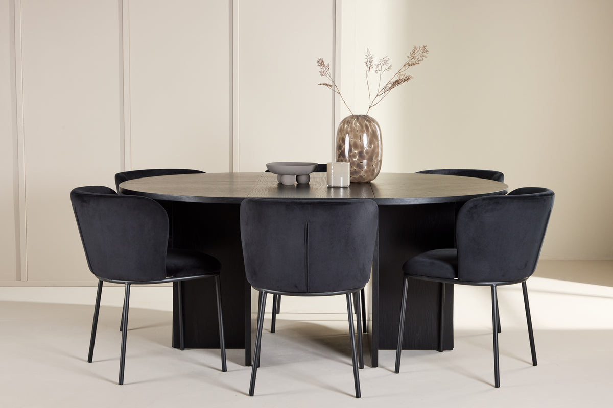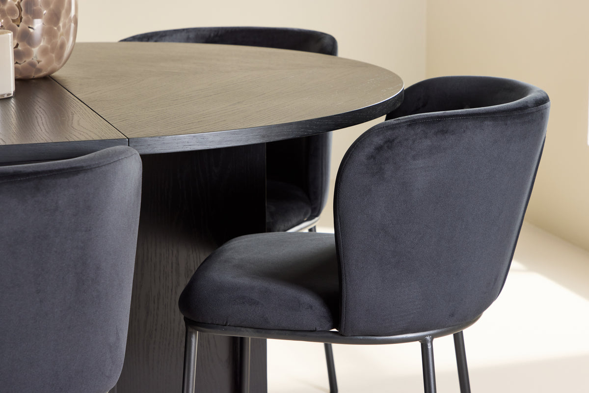 Uppgradera din matplats med denna eleganta matgrupp, bestående av det stiliga matbordet Strada och de lyxiga matstolarna Edina. Tillsammans skapar de en sofistikerad och inbjudande atmosfär, perfekt för både vardagliga måltider och större sammankomster. Matbordet Strada kombinerar modern design och flexibilitet med sin svarta fanerträkonstruktion, vilket ger bordet en tidlös och elegant känsla. Med en ursprunglig diameter på 120 cm skapar bordet en intim matplats, men kan enkelt förlängas till 170 cm för att ge extra plats när du har gäster. Förlängningsfunktionen är smidigt integrerad och gör bordet både praktiskt och stilfullt. Matstolarna Edina är klädda i svart sammet som ger stolen en rik och glamorös känsla. Den djupa, svarta nyansen tillför en sofistikerad elegans, och den lyxiga sammetsytan gör varje sittning extra bekväm. Edina är designad med både estetik och ergonomi i åtanke, vilket gör den idealisk för långa middagar och sociala tillställningar. Tillsammans erbjuder matbordet Strada och matstolarna Edina en perfekt balans mellan funktionalitet och stil. Den svarta fanerträkonstruktionen på bordet och de eleganta svarta sammetsstolarna skapar en harmonisk och stilren miljö, vilket gör varje måltid till en elegant upplevelse.