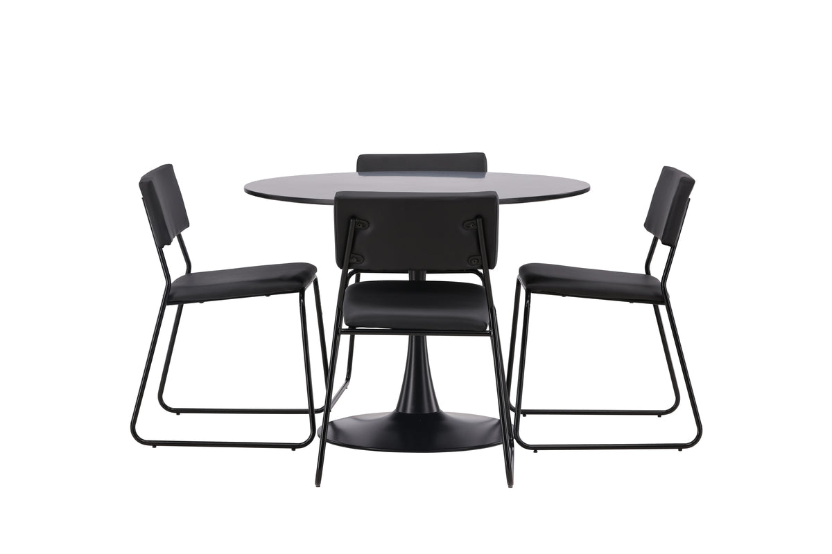 Minimalistisk och trendsäker - en matgrupp med alla rätt! Glade matbord har en stilren Skandinavisk design med en smäcker trumpetfot i svart stål och en svart bordsskiva i MDF. Här tillsammans med våra svarta matstolar från serien Kenth. Den minimalistiska, moderna designen skapar en luftig känsla. Stolen har en rygg och sits i svart polyuretanskinn och polyester samt dekorativt smala stolsben i järn. Inred hemmets hjärta tidlöst och stilrent! Bordets mått: 100cm.