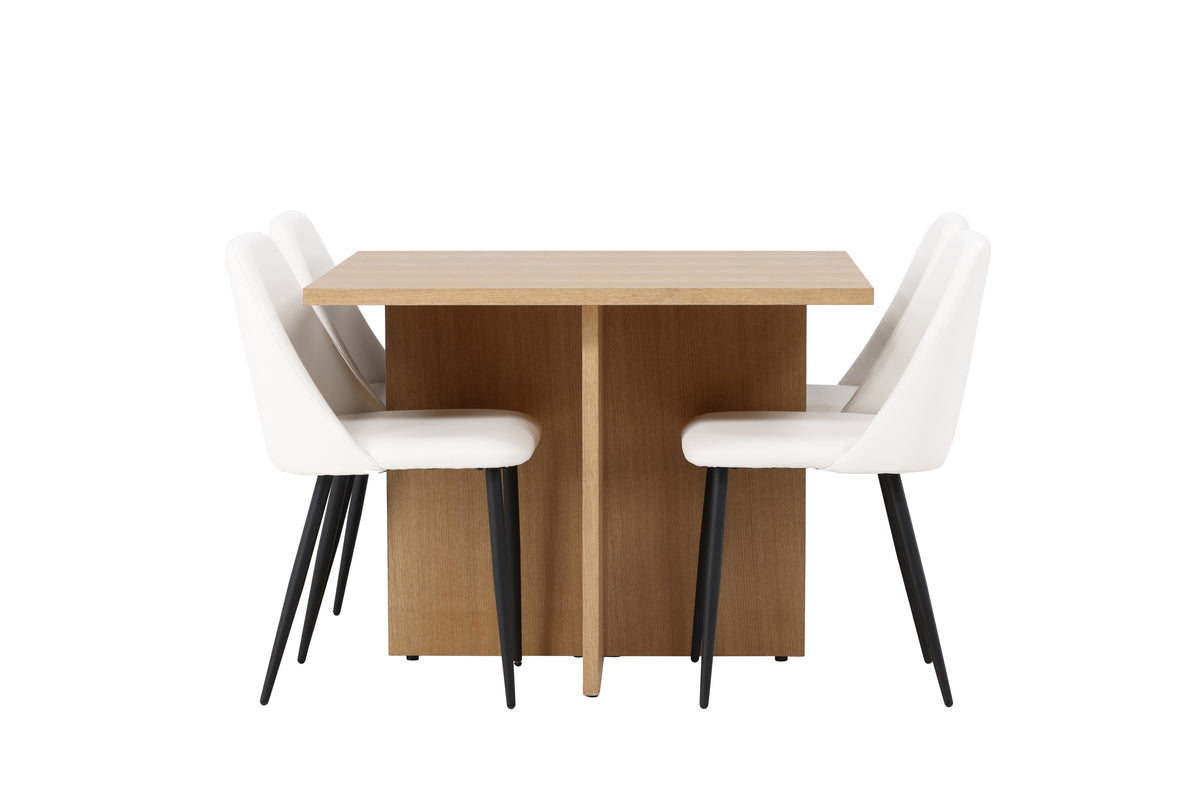 Sprid värme och trivsamhet i ditt hem med en naturnära matgrupp i trä som kombinerar stilrena former med klassisk design! Vårt vackra, träfärgade matbord Leo är tillverkat i ek-färgat MDF och har en kvadratisk bordsskiva som ger en stilren och modern känsla. Med sina kryssade träskivor som stomme blir bordet både stabilt och estetiskt tilltalande. Bordets mått: 100x100cm. För att komplettera det kvadratiska matbordet har vi valt ut matstolar från den populära serien Night. Dessa matstolar har en exklusiv touch med helklädd sits i vitt konstläder och svarta stolsben som blir en snygg kontrast. Stolens utformning och klädsel bidrar till ett kaxigt och personligt blickfång som kommer imponera på både dig och dina gäster. Med den här matgruppen får du en möjlighet att skapa en personlig och inbjudande miljö där du och dina vänner kan njuta av gemensamma måltider, lika stilfullt som bekvämt!