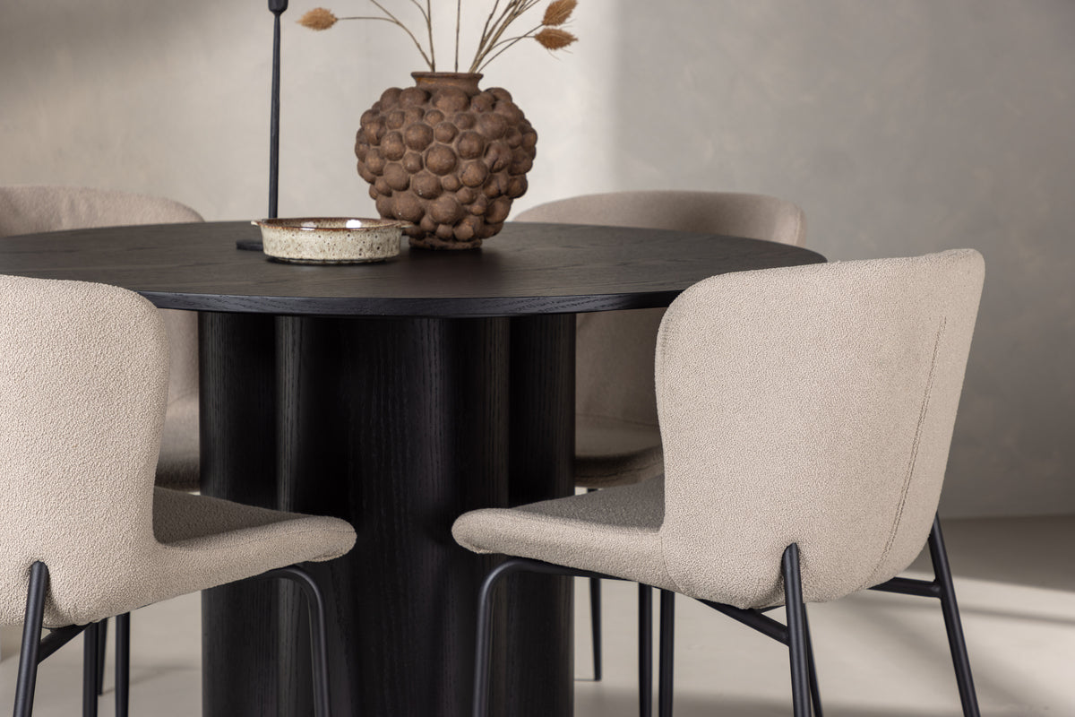 Skapa en inbjudande atmosfär i hemmets hjärta med den här snygga matgruppen! Stolarna är från serien Modesto och har en klädsel i beige lurvigt bouclétyg samt stilrent smala stolsben i svart metall. Den lätt rundade ryggen och stoppade sittdynan ger extra komfort och förlänger trivsamma måltider kring matbordet. Här omkring vårt runda matbord Olivia. Bordet har en genomgående helhetsdesign i svart MDF med en tunn, rund toppskiva och tre cylinderformade ben som sitter samlat under bordets mitt. Kulören har en lätt täcknad på den fanerade skivan vilket synliggör materialets mönster som ger liv och rörelse till möbeln. Det ska kännas skönt att slå sig ner för en god måltid!