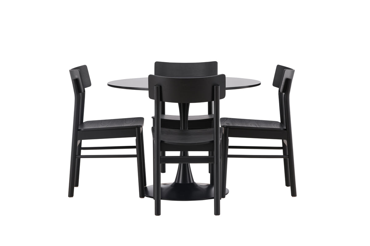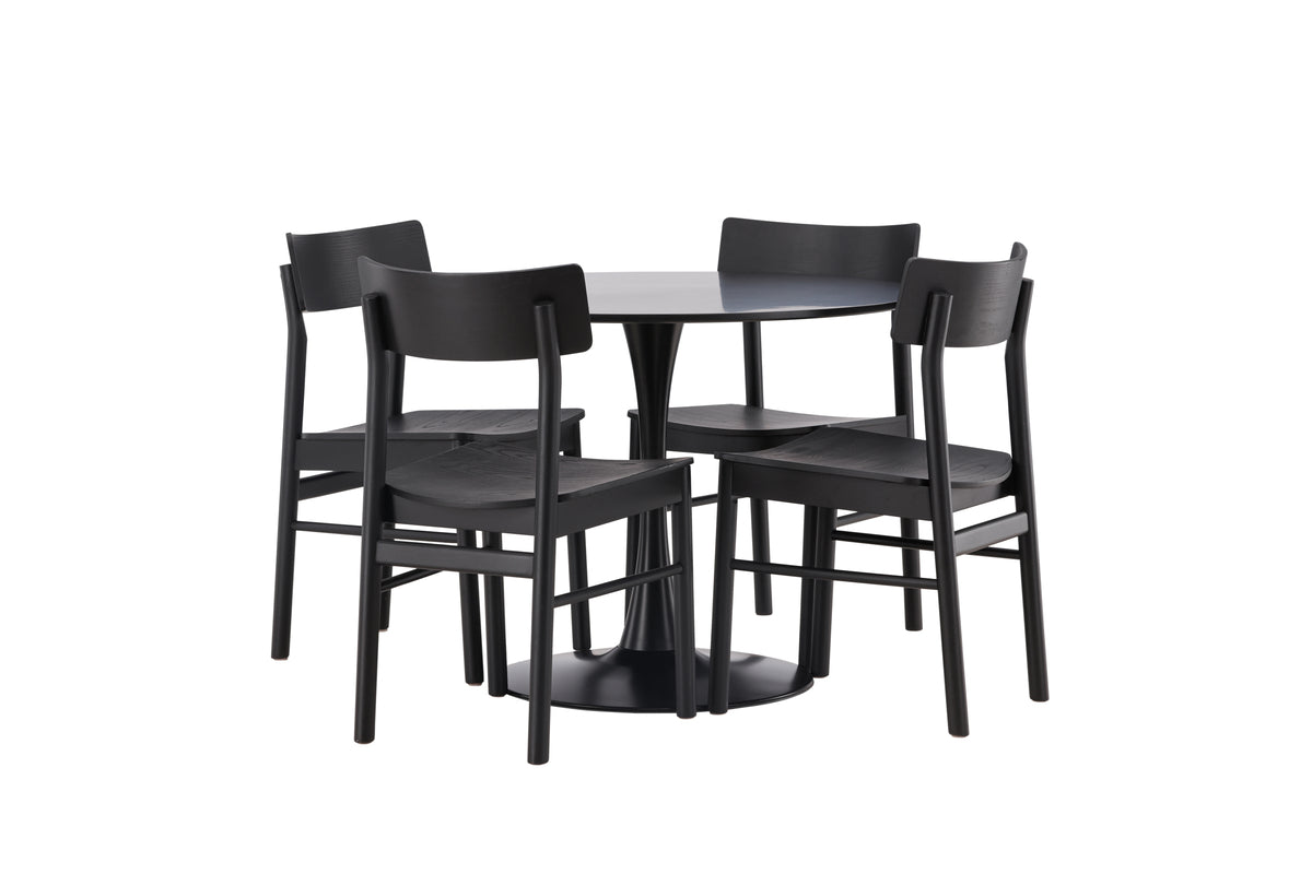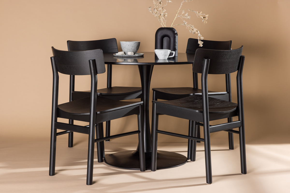 Upptäck den stilfulla matgruppen som kommer att lyfta din matsal till en elegant och inbjudande plats för måltider och umgänge. Med vårt Glade-bord och Montros-stolar får du både stil och funktionalitet. Glade-bordet har en generös diameter på 100 centimeter och är tillverkat av MDF-material med stadiga stålben som ger stabilitet. Den eleganta svarta färgen ger en touch av modernitet och sofistikering till din matsal. Montros-stolarna är både snygga och bekväma, perfekta för långa stunder vid matbordet. Deras svarta färg och ram av björk ger en tidlös och stilren känsla till hela matgruppen. Oavsett om det är en intim måltid med familjen eller en festlig tillställning med vänner, vår matgrupp erbjuder den perfekta platsen för alla tillfällen. Uppgradera din matsal idag och låt vår matgrupp bli en central del av ditt hem.