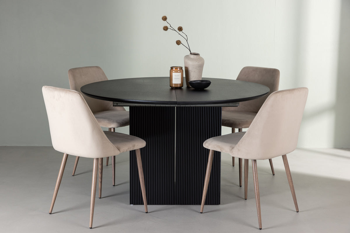 Smart, snyggt och stilrent – en praktisk matgrupp som snabbt anpassar sig efter dina behov och antal gäster. Slipp oroa dig över att alla inte ska få plats! Vårt runda matbord Matilda är skapat för att passa dina behov perfekt. Med sin runda toppskiva i svart MDF med faner och sin robusta stomme av klossformade ben ger Matilda en stilfull touch till ditt hem. Bordet är förlängningsbart och blir snabbt ett ovalt bord när du har familj och gäster på besök. Bordets mått i diameter: 130cm. Tillsammans med våra bruna matstolar från den omtyckta serien Night skapar du en hemtrevlig atmosfär med en touch av naturlig skönhet. Stolen Night har en jordnära kulör som definitivt kommer att imponera på dina gäster. Med en helklädd sits i brunt sammetstyg och eleganta stolsben i valnötsfärgat stål erbjuder Night-serien en perfekt balans mellan komfort och stil. Här erbjuds du den ultimata kombinationen av anpassningsbarhet och elegans. Låt ditt vardagsrum spegla din personliga stil och skapa minnesvärda stunder med familj och vänner – här hamnar ingen på kanten!