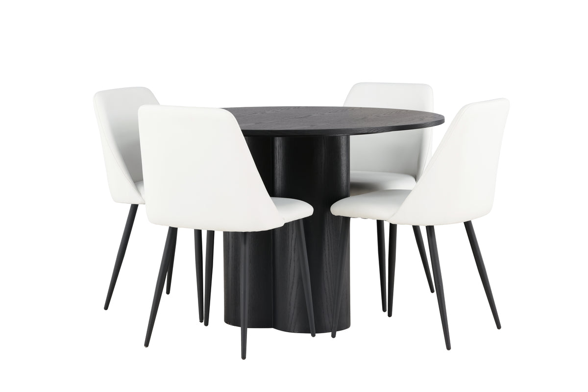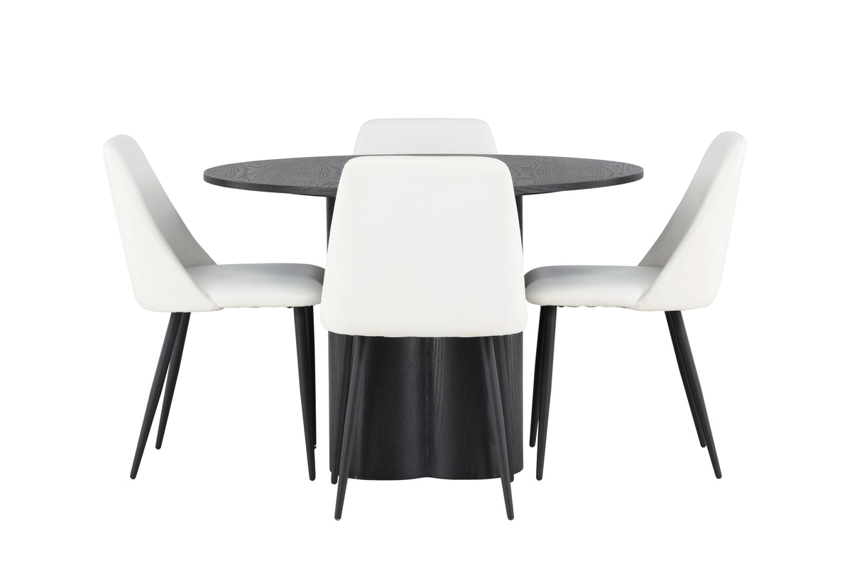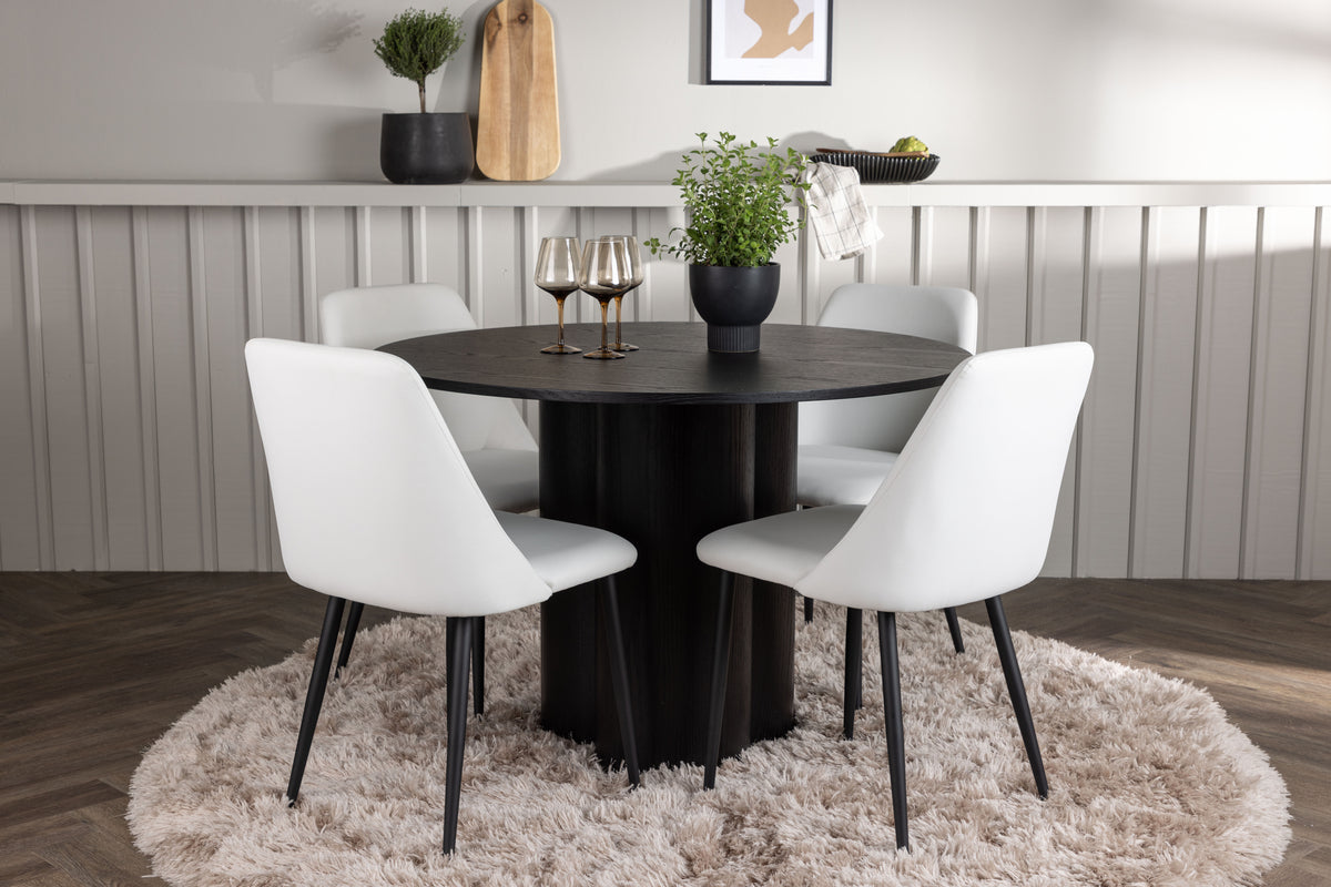 Kombinera kulörer och material som i den här matgruppen och märk hur stilnivån i ditt hem höjs! Vårt runda matbord Olivia är ett mästerverk av design och funktionalitet. Bordet kommer i en sotig svart kulör och har en tunn, rund toppskiva. De tre cylinderformade benen, som elegant är placerade under bordets mitt, ger en stadig och balanserad grund. Genomgående tillverkat i hållbar MDF. Bordets mått: 110cm. Här i underbar kombination med våra vita matstolar från serien Night. Den vita PU-klädseln ger en känsla av exklusivitet och dessutom underbar komfort. Stolens ben i svart stål är inte bara robusta, de bidrar också till dess moderna och distinkta utseende och tack vare den stoppade sitsen kan du sitta länge vid middagsbordet utan att kompromissa med komforten. Med den här matgruppen kan du skapa en atmosfär som andas tidlös elegans och exklusivitet. Varje detalj är noga utvald för att ge dig den bästa kombinationen av stil och komfort, så låt ditt hem utstråla detta och möblera inbjudande framöver!