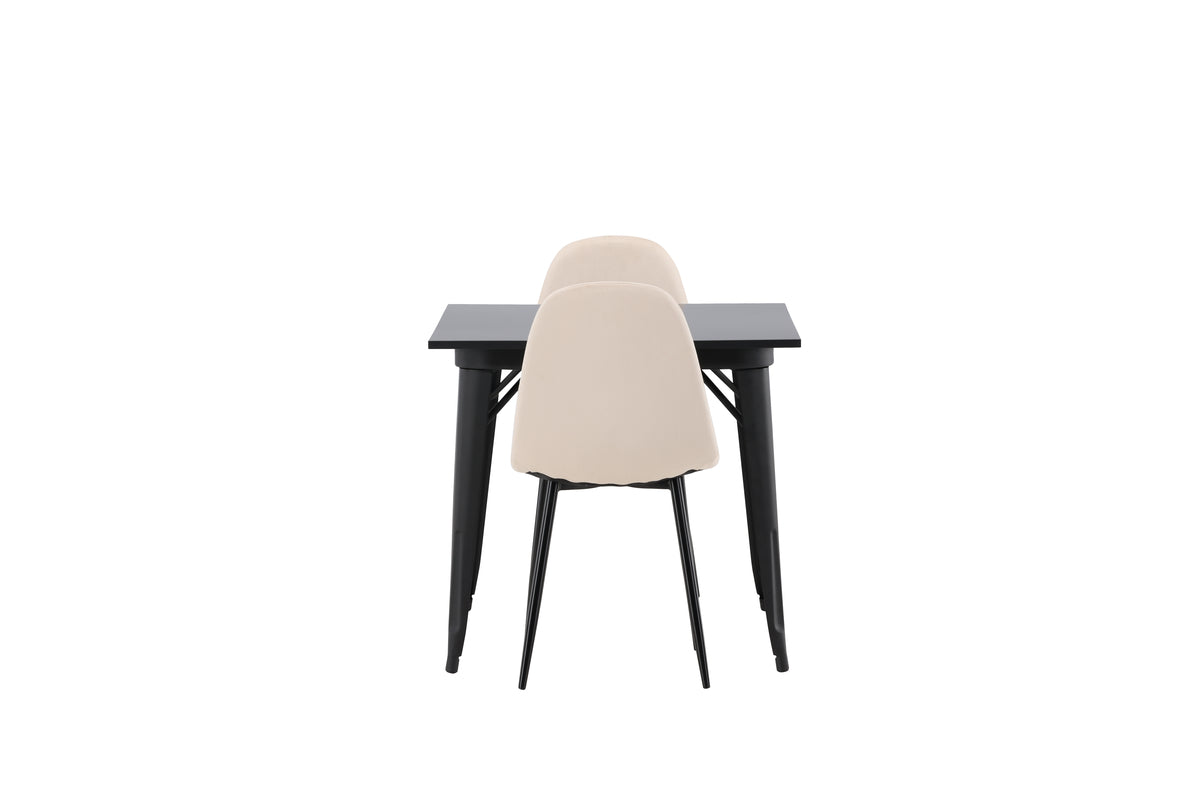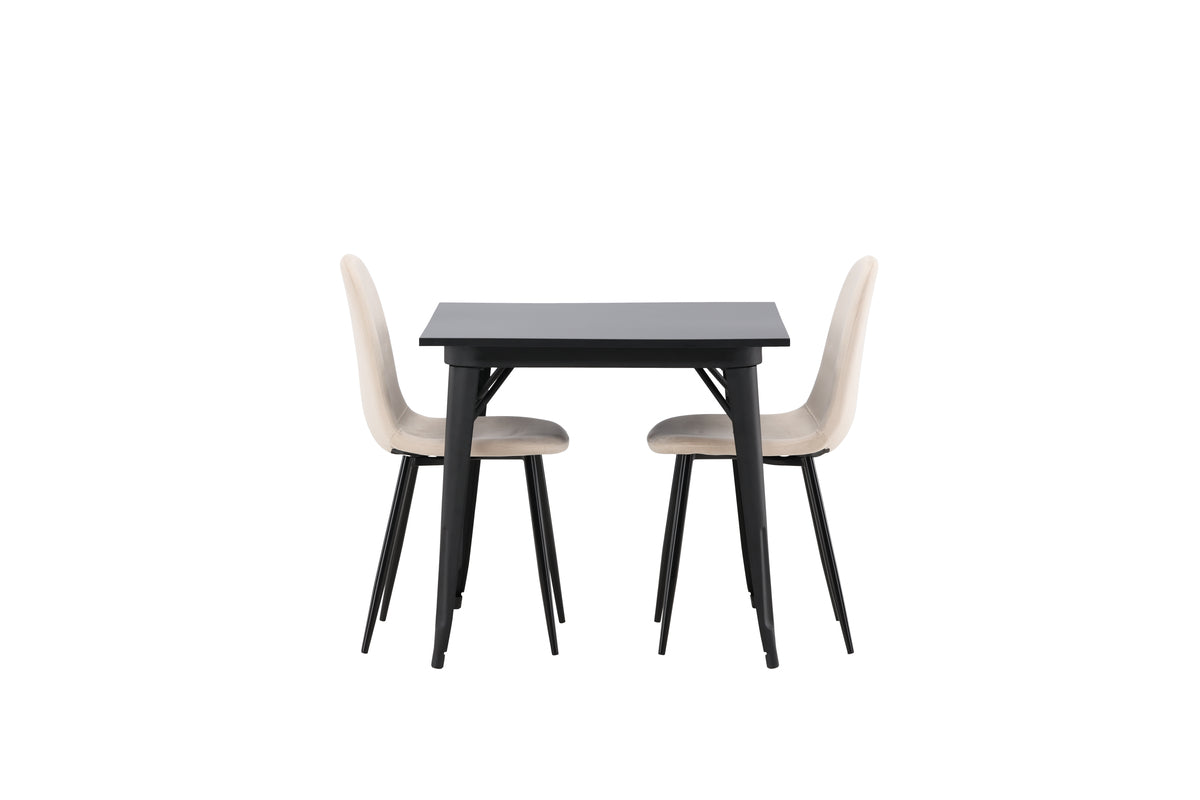 En charmig matgrupp för två - perfekt för det lilla köket! Det här matbordet från serien Tempe har en klassisk, kvadratisk utformning och en tidlös svart kulör. Bordsskivan är i svart MDF och bordsbenen i svart metall. Här i smakfull kombination med två matstolar från serien Polar i champagnefärgad nyans. Stolen har en helklädd design med en rundad rygg och sits i beige sammetstyg med mjuk stoppning och ben i svart pulverlackerad metall. Slipp kompromissa mellan komfort och design!