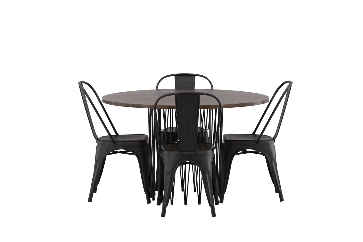 En robust matgrupp som bjuder in till sociala stunder! Vårt runda matbord Stone har en läcker Skandinavisk design som faller många i smaken. Bordet har en vacker brunfärgad bordsskiva i MDF med faner och en dekorativ cylinderformad stomme i svart metall. Här tillsammans med matstolar från serien Tempe. Stolen har lätt utsvängda ben som följsamt möter sitsen och ryggstödet i en stilsäker utformning, genomgående tillverkad i svart metall. Möblera smart och stilrent!