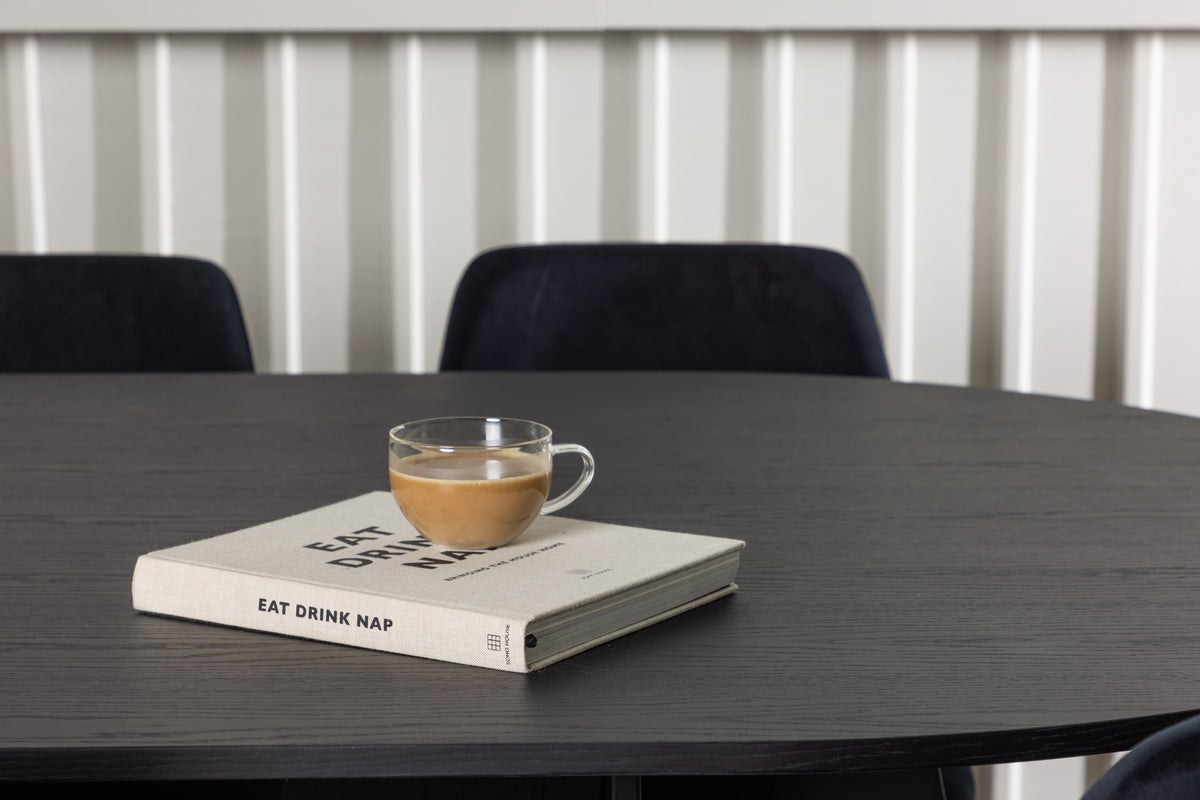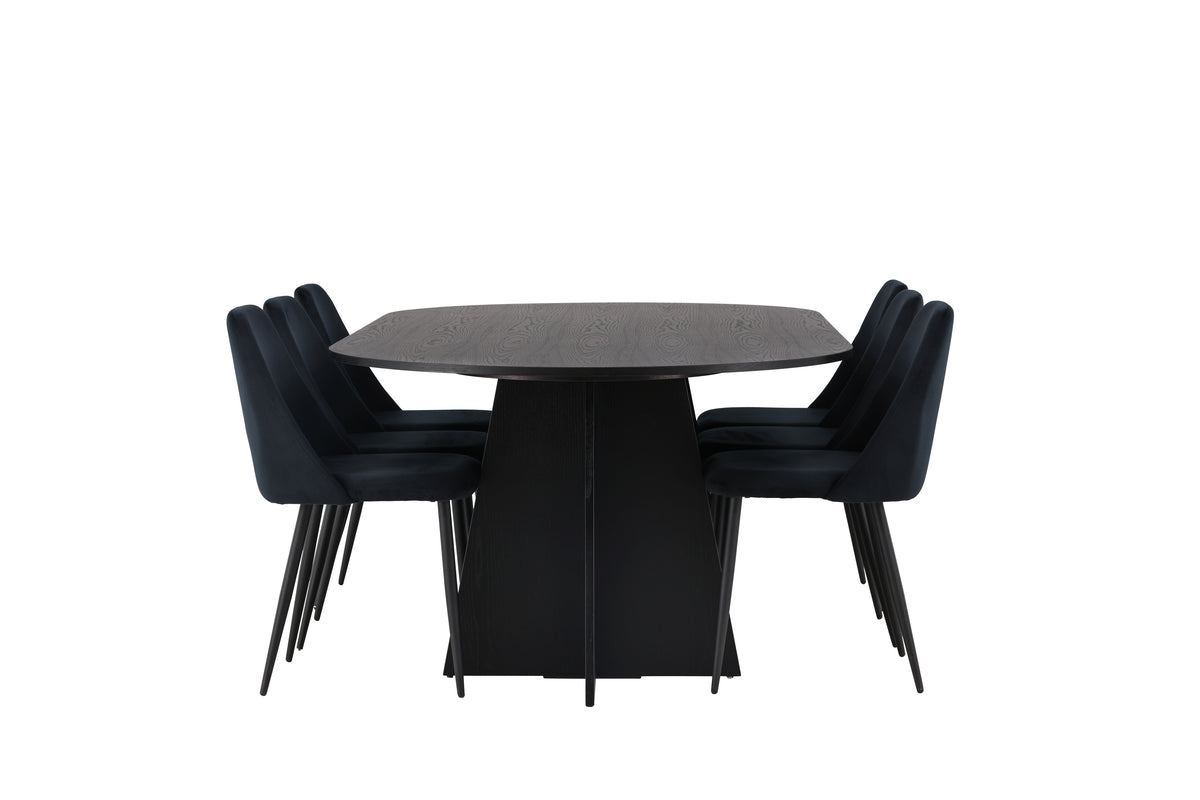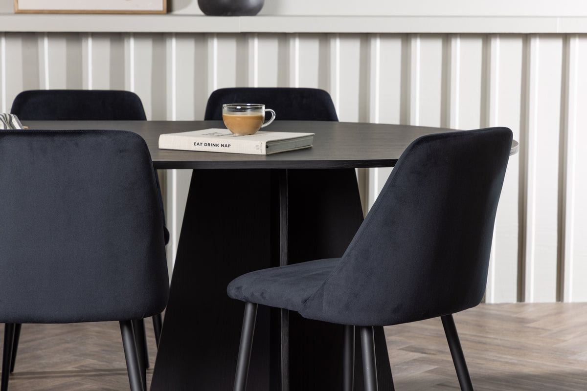 Kom in i vardagsrummet och möts av en enastående matgrupp som kombinerar stil och komfort på ett elegant sätt! Det ovala matbordet Bootcut är ett mästerverk av modern design. Med en oval bordsskiva tillverkad av svart MDF med fanéer, skapar det en känsla av exklusivitet i ditt hem. Den tunna bordsskivan ger ett minimalistiskt intryck som kompletteras perfekt av de robusta och unikt utformade benen. Bordets mått: 115x230cm. Här i perfekt kombination med svarta matstolar från serien Night. Med helklädd sits i sammetsmjukt svart tyg erbjuder Night matstolar en komfort som du gärna sitter kvar länge i under långa och härliga måltider. De matchande svarta stolsbenen ger en elegant och enhetlig estetik till hela blickfånget. Varje stol skapar därtill ett lyxigt skimmer i rummet och bidrar till en inbjudande atmosfär för dina gäster. Med den här otroliga matgruppen höjer du hela stilnivån i hemmet. Låt matgruppen sätta tonen för inredningen och skapa en charmig mittpunkt att samla nära och kära kring!