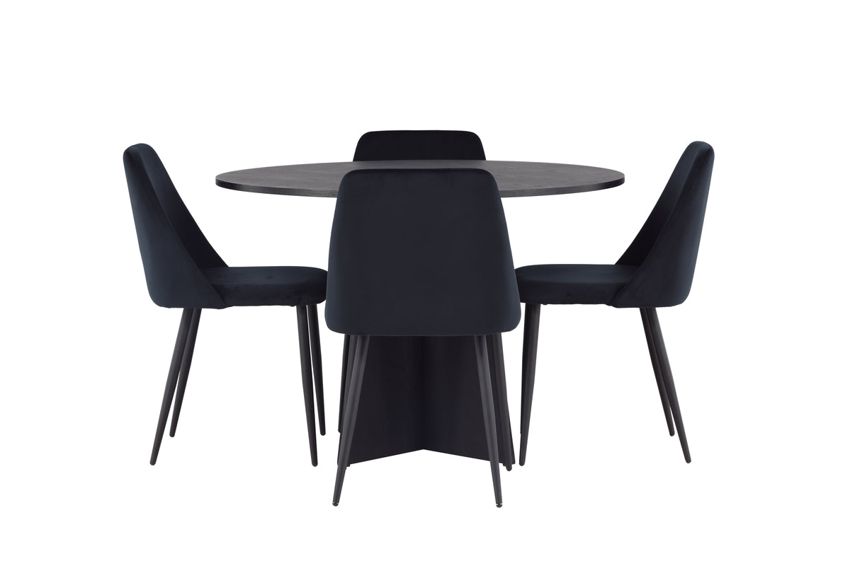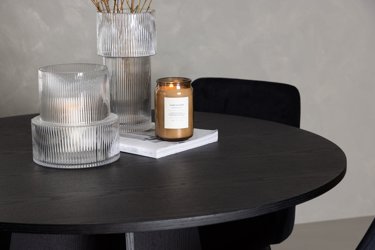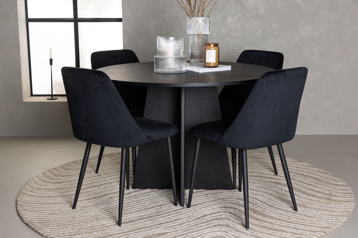 Få ditt hem att glänsa med den här matgruppen i skandinavisk stil och sotig svart kulör! Detta eleganta matbord från serien Bootcut är perfekt för familjens sammankomster. Den familjära runda bordsskivan skapar en varm och inbjudande atmosfär. Tillverkat med omsorg av MDF med faner, ger detta bord inte bara stil utan också hållbarhet och kvalitet. Den designrika stommen blir pricken över i:et. Bordets mått: 110cm. Tillsammans med det runda matbordet Bootcut kommer våra sammetsstolar från serien Night. Stolens helklädda sits i svart sammetstyg ger en exklusiv känsla och de matchande svarta stolsbenen är ett perfekt komplement. Med den här kombinationen kan du skapa en lyxig atmosfär och ett modernt utseende i ditt hem. Oavsett om matgruppen är till vardagsmiddagar eller för att imponera på gästerna, kommer den att ge rummet ett skimmer av elegans och bidra till en inbjudande atmosfär!