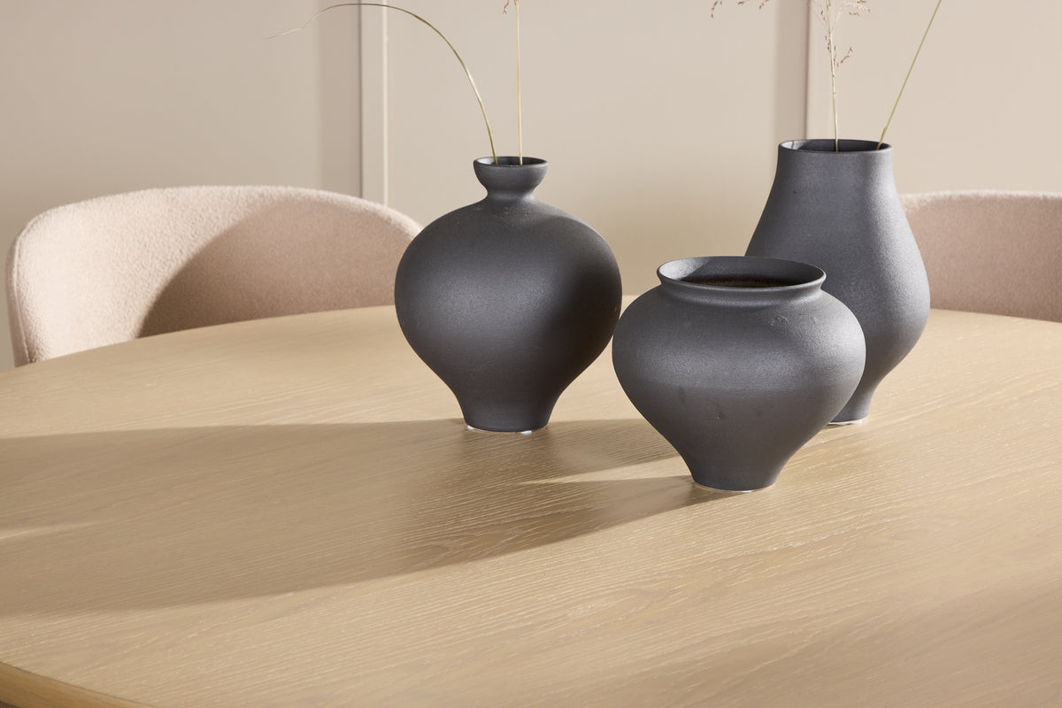 Förvandla din matplats med denna eleganta och stilrena matgrupp, som kombinerar tidlös design och lyxig komfort. Matbordet Copenhagen och matstolarna Astoria skapar en inbjudande och harmonisk atmosfär, perfekt för både vardagliga måltider och festliga tillställningar. Matbordet Copenhagen är en vacker möbel som förenar skandinavisk minimalism med praktisk funktion. Den rundade bordsskivan, som har en generös diameter på 140 cm, ger gott om plats för att samla familj och vänner. Den vittvättade ytan framhäver träets naturliga struktur och ger bordet en ljus och luftig känsla som smälter in i både moderna och klassiska inredningsstilar. Den neutrala nyansen på bordsskivan gör det lätt att matcha med olika färger och inredningsdetaljer, vilket gör Copenhagen till ett tidlöst val för ditt hem. Tillsammans med bordet kommer matstolarna Astoria, som är klädda i exklusiv beige bouclé. Den mjuka och lyxiga texturen på bouclétyget ger stolarna en sofistikerad och inbjudande känsla, perfekt för att skapa en varm och ombonad matplats. Stolarna har ett ergonomiskt designat ryggstöd och en bekväm sits som gör dem ideala för långa, njutbara måltider. Den subtila strukturen på tyget och den naturliga nyansen gör att stolarna enkelt kan integreras i olika inredningsstilar. Låt denna matgrupp med Copenhagen och Astoria bli mittpunkten i ditt hem, där den eleganta designen och den genomtänkta komforten gör varje måltid till en stilfull och avkopplande upplevelse.