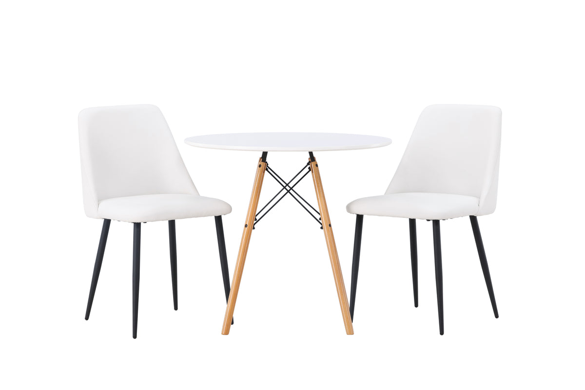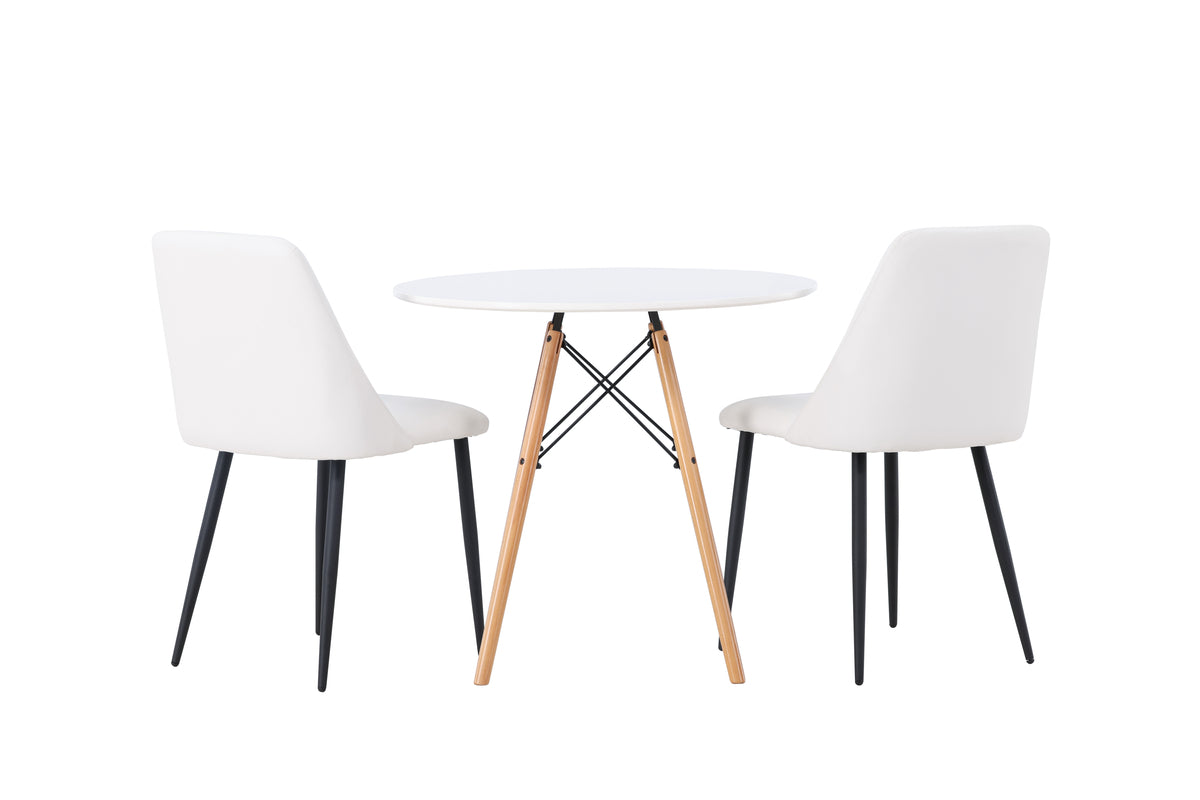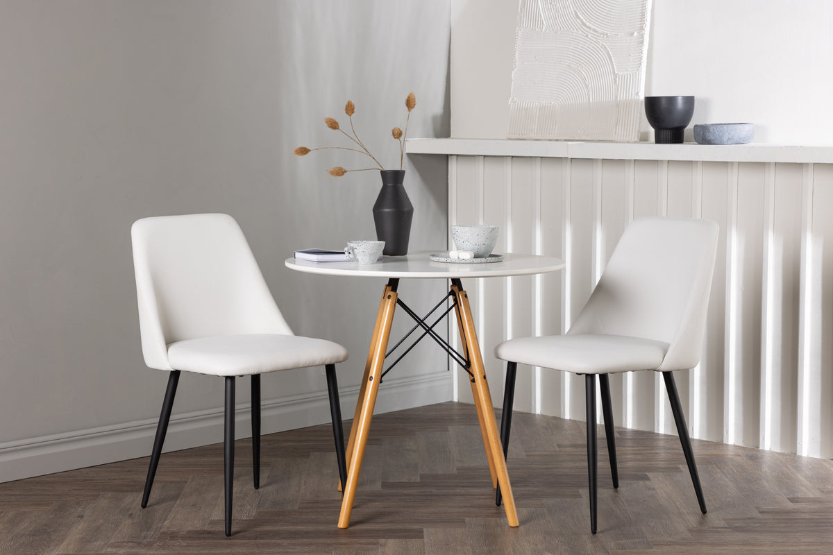 Mjuka och inbjudande former! Det runda matbordet Danburi har en klassisk design med en rund bordsskiva i vit MDF och lätt utsvängda ben i bokträ med dekorativa detaljer i svart stål. Här i snygg kombination med vita matstolar från serien Night. Stolen har en helklädd sits i vit PU klädsel som känns lika lyxig som elegant och benen är i svart stål. Sitsen är även stoppad för extra komfort. Den här matgruppen andas lyx och bekvämlighet! Bordets diameter: 60cm.