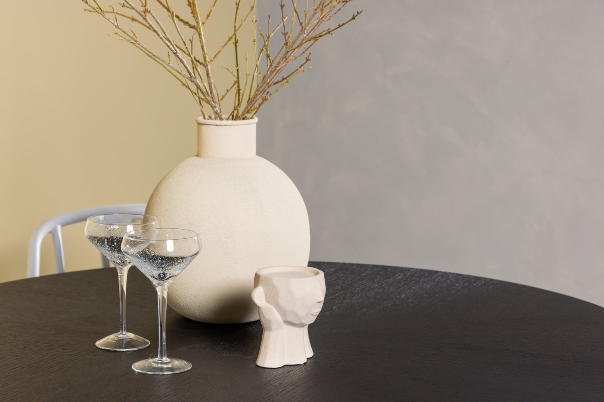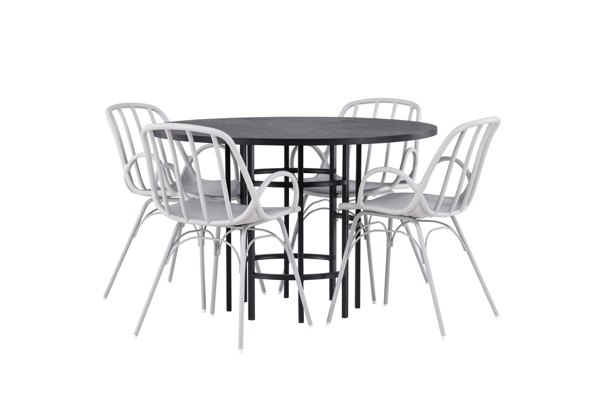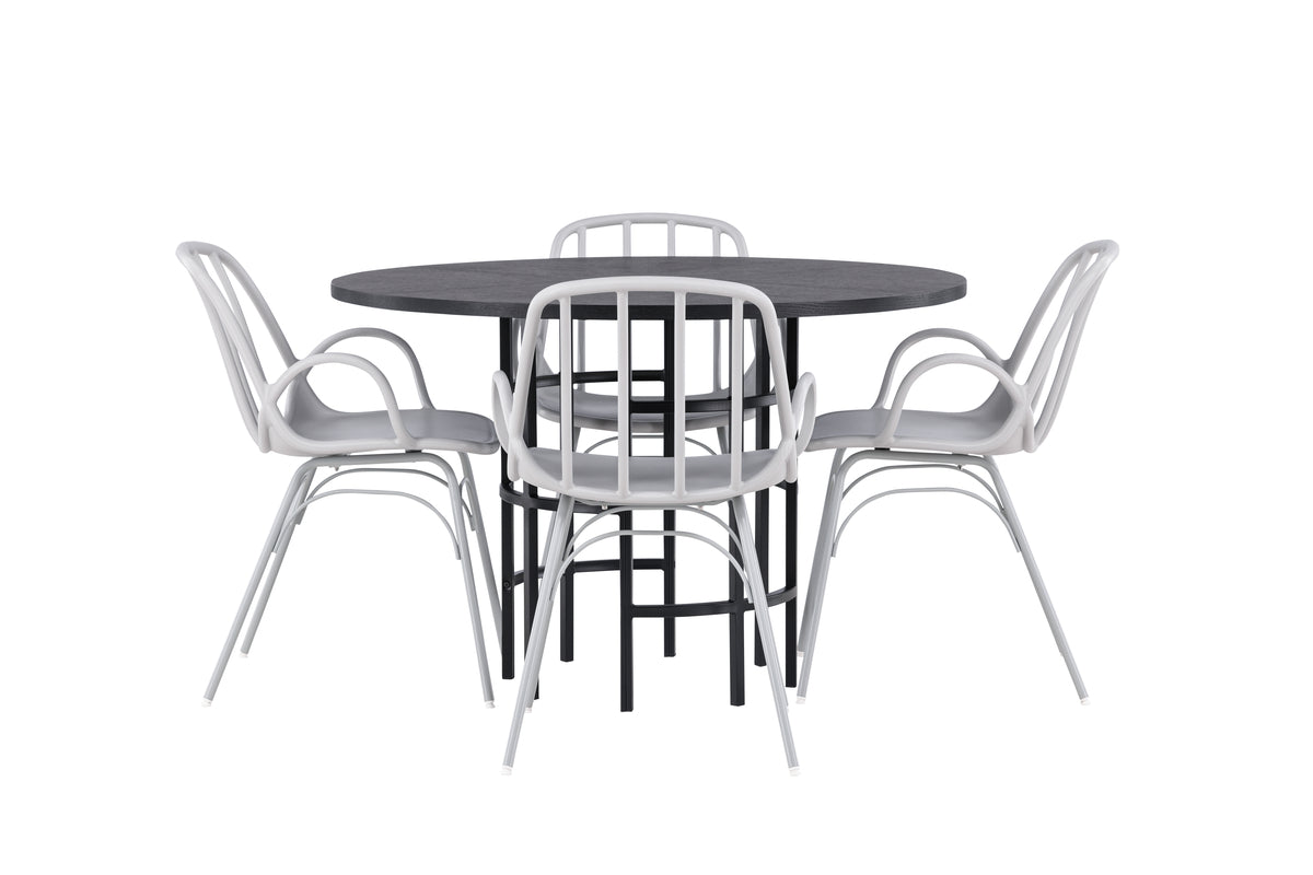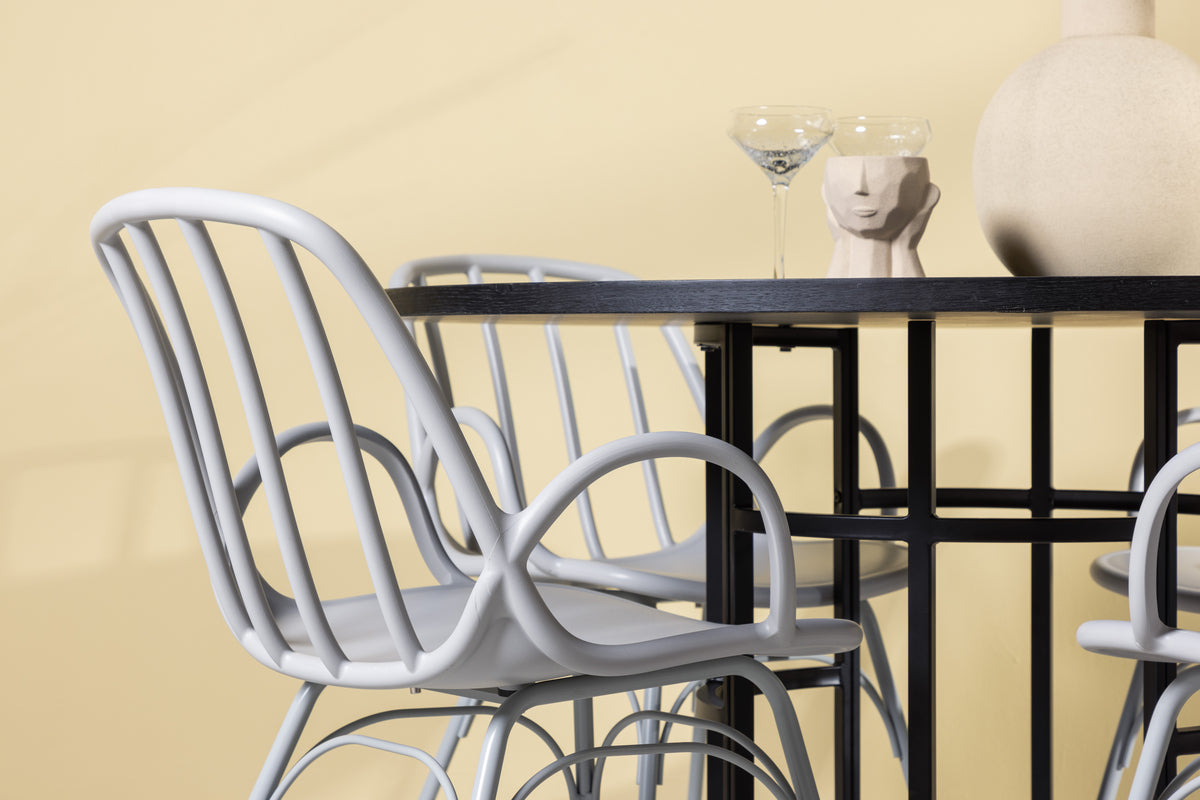 En underbar färgkombination och mjuka former! Vårt runda matbord Copenhagen har en elegant, svart bordsskiva i MDF och ett dekorativt, cylinderformat underrede i svart metall. Här med våra populära matstolar från serien Dyrön. Stolen är lika stilren som praktisk, tillverkad i greige plast och stål. Sitsen har integrerade armstöd och en ribbad design i den lätt rundade ryggen. Stolsbenen är stilrent smala och lätt utsvängda i Skandinavisk design. Här får du en snygg matgrupp som står sig över tid! Bordets mått: 115cm.