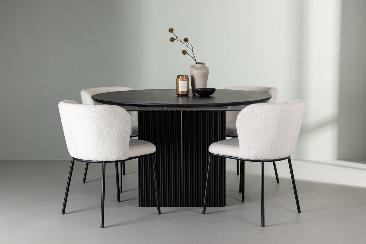 Möblera smart och flexibelt med en förlängningsbar matgrupp som anpassar sig efter dina behov! Det runda matbordet Matilda i svart färg har en rund toppskiva i svart MDF med faner som ger en modern och elegant touch till ditt hem. Men det är inte bara utseendet som imponerar, för under ytan döljer sig en smart funktion. Matbordet är förlängningsbart, vilket innebär att du enkelt kan omvandla det till ett längre, ovalt matbord när du har fler gäster på besök. Inget behov av att trängas runt ett för litet bord längre! Bordets mått i diameter: 130cm. Här har vi matchat matbordet med våra vita matstolar i boucletyg från serien Edina. Edina fångar verkligen de senaste trenderna. Med en följsam och helklädd sits i vitt boucletyg samt minimalistiska stolsben i svart metall, kombinerar denna matstol stilren design med underbar komfort. Ge hemmets hjärta en känsla av harmoni och elegans med matgruppen Matilda och Edina. Med deras rena linjer, stilfulla materialval och bekväma utformning skapar de en inbjudande atmosfär där du och dina gäster kan njuta av måltider med stil och komfort!