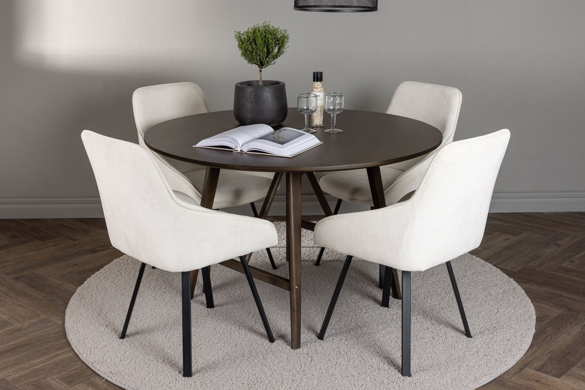 Möblera ditt hem elegant och lyxigt med den här inbjudande matgruppen i skandinavisk stil. Den är verkligen perfekt för dig som söker en stilfull och samtidigt funktionell inredning! Vårt runda matbord Kaseidon i mörkbrunt trä erbjuder både form och funktion. Med sin runda MDF-bordsskiva blir det en naturlig samlingsplats för familj och vänner där ingen hamnar på kanten. Dess lätt utsvängda bordsben i gummiträ ger bordet en stadig look som står sig över tid. Bordet har en modern valnötsfärgad kulör som ger en varm och inbjudande känsla, vilket skapar en harmonisk atmosfär i ditt matrum. Bordets mått: 100cm. De stilrena matstolarna från serien Rosie är det perfekta komplementet till Kaseidon-bordet. Med sina integrerade armstöd och helklädda sits i beige tyg ger de en otrolig komfort och elegans till din matgrupp. De lätt utsvängda stolsbenen i svart metall ger stolarna en skandinavisk touch som passar perfekt till den moderna inredningsstilen. Dess modemedvetna design kommer garanterat ge ditt vardagsrum eller kök en känsla av stil och charm. Ge dig själv och dina gäster den ultimata matupplevelsen med den här lyxiga matgruppen. Den kombinerar kvalitet, stil och komfort på det bästa sättet och ser till att alla måltider framöver blir trivsamma!