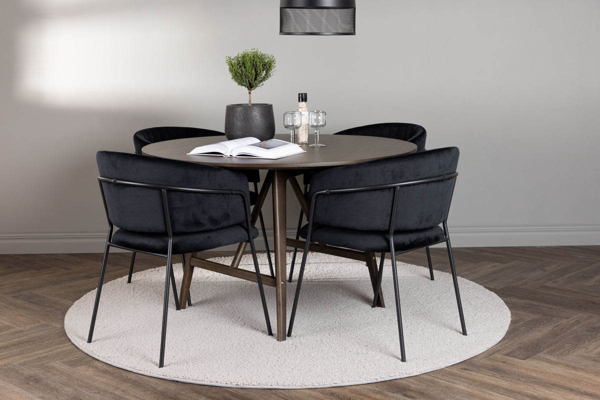 Skapa en elegant mittpunkt att samla vänner och familj runt – En inbjudande matgrupp som är perfekt för det stilrena hemmet! Vårt bruna matbord Kaseidon har en rund MDF-bordsskiva och lätt utsvängda ben i hållbart gummiträ. Vad som verkligen gör bordet till en favorit i många hem är däremot den moderna valnötsfärgade kulören som smidigt passar in i det stilrena hemmet och ger en jordnära ton till inredningen. Bordets mått: 100cm. Tillsammans med våra svarta matstolar från serien Selma skapar du en mittpunkt som inte bara är snygg utan också otroligt bekväm. Stolarna har en helklädd design med en lätt rundad rygg och en sits i sammetstyg som ger snyggt lyster till rummet. De snygga dekorsömmarna ger extra detalj och förhöjer känslan av exklusivitet. Stolsbenen är tillverkade av smalt svart stål och ger ett modernt och stilrent intryck. Så om du vill ha en matgrupp som inte bara ger dig stil och elegans utan också komfort och lyx, leta inte längre. Den här matgruppen är den perfekta kombinationen för ditt stilrena hem. Skapa en charmig mittpunkt som får dina gäster att bli koppla av och där du kan njuta av härliga stunder tillsammans!