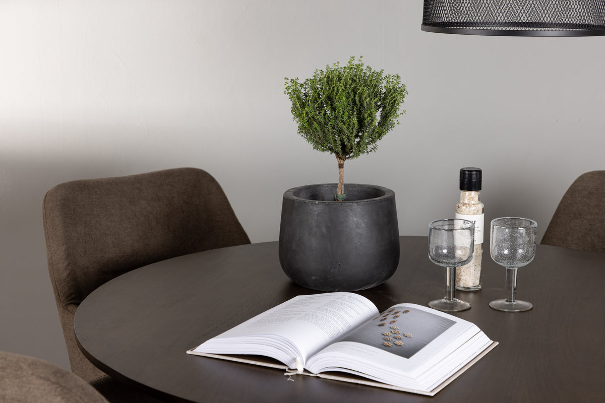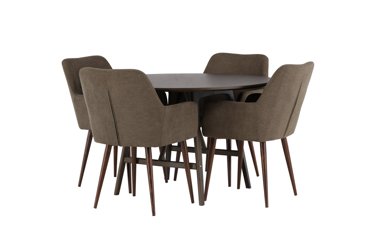 Sitt skönt och njut av mysiga måltider framöver kring en matgrupp som utstrålar charm och bekvämlighet! Vårt mörkbruna matbord Kaseidon lockar direkt med sin runda form och moderna valnötsfärgade kulör. Den matta ytan på bordsskivan, tillverkad av MDF, ger en sofistikerad touch till ditt vardagsrum. Med lätta utsvängda ben och en stabiliserande stomme i gummiträ erbjuder bordet både stil och hållbarhet. Bordets mått: 100cm. I kombination med våra bruna matstolar från serien Tomorrow skapas en perfekt harmoni i hemmets hjärta. Med sin helklädda sits i brunt polyestertyg och integrerade armstöd erbjuder dessa stolar enastående komfort. De lätta utsvängda stolsbenen i den moderna valnötsbruna kulören bidrar till att skapa en enhetlig look i ditt vardagsrum eller kök. Här får du inte bara en elegant inredning, utan även en möjlighet att skapa en trivsam atmosfär för långa och njutbara måltider. Låt skratt och samtal flöda kring en matgrupp där ingen riskerar hamna på kanten!