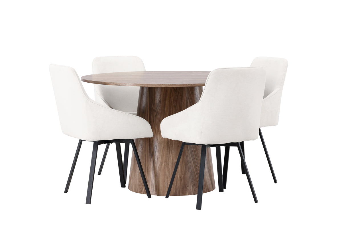 Elegant och modernt! Vårt underbara, runda matbord Lanzo har en genomgående helhetsdesign i MDF med en tunn toppskiva och en vriden cylinderformad stomme som är centrerad under bordets mitt. Kulören är jordnära och synliggör materialets mönster. Här i stilren kombination med beige matstolar från serien Rosie. Stolen har en helklädd sits med integrerade armstöd i beige tyg och lätt utsvängda stolsben i svart metall. Den mjuka sitsen är stoppad för extra komfort och bjuder in till långa trivsamma middagsstunder. Bordets diameter: 120cm.