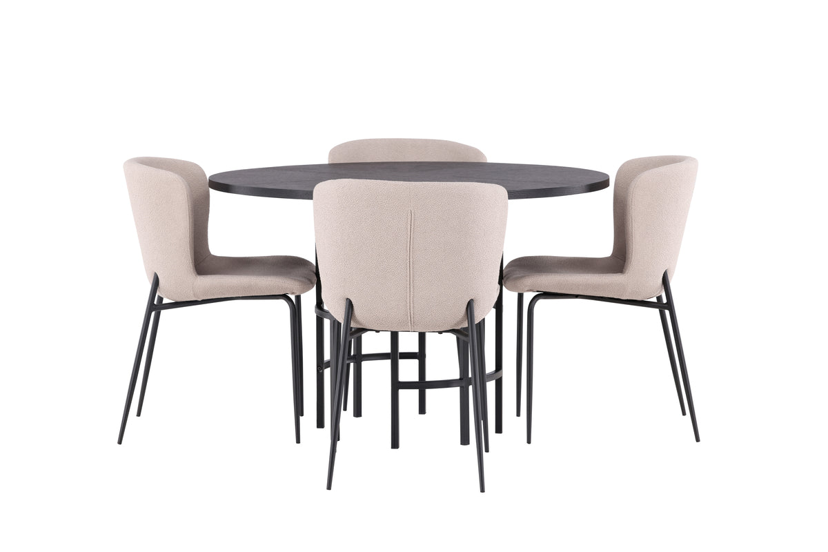 En trendsäker matgrupp med mjuka former! Vårt runda matbord Copenhagen har en elegant, svart bordsskiva i MDF och ett dekorativt, cylinderformat underrede i svart metall. Här i snygg kombination med våra trendiga matstolar från serien Modesto. Stolen är helklädd i grått lurvigt tyg med stilrent smala stolsben i svart metall. Den lätt rundade ryggen och stoppade sittdynan ger extra komfort och förlänger trivsamma måltider kring matbordet. Här möter industriell design mjuka former! Bordets mått: 115cm.