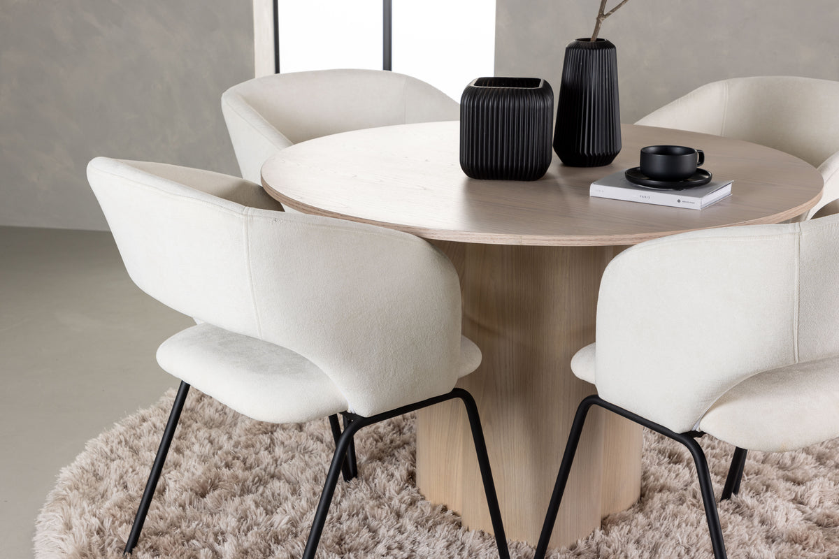 Sätt tonen i ditt hem med en modemedveten matgrupp i skandinavisk stil! Vårt runda matbord från serien Olivia klättrar på trendlistorna med sin moderna utformning. Bordet har en genomtänkt helhetsdesign i vitputsad MDF, som ger en ren och stilren känsla till ditt vardagsrum. Den tunna och runda toppskivan ger en modern touch, medan de tre cylinderformade benen smälter samman under bordets mitt och skapar en harmonisk balans. Bordets mått: 110cm. Här i alldeles perfekt match med våra vita matstolar från serien Day. Dessa matstolar fångar omedelbart uppmärksamheten med sin genomtänkta design, mjuka kurvor och minimalistiska struktur. Med en helklädd sits i vitt linnetyg och ett öppet ryggslut erbjuder de en bekväm och inbjudande plats att sitta på under måltiden. Stolsbenen är smala och tillverkade av svart stål, vilket blir en snygg kontrast. Den här inbjudande matgruppen ger inte bara en estetiskt tilltalande atmosfär till ditt hem, utan också en praktisk och funktionell plats för att njuta av måltider med familj och vänner. Medan du kopplar av i dessa bekväma matstolar kommer du att känna en känsla av lyx och stil. Skapa en mysig mittpunkt i ditt hem!