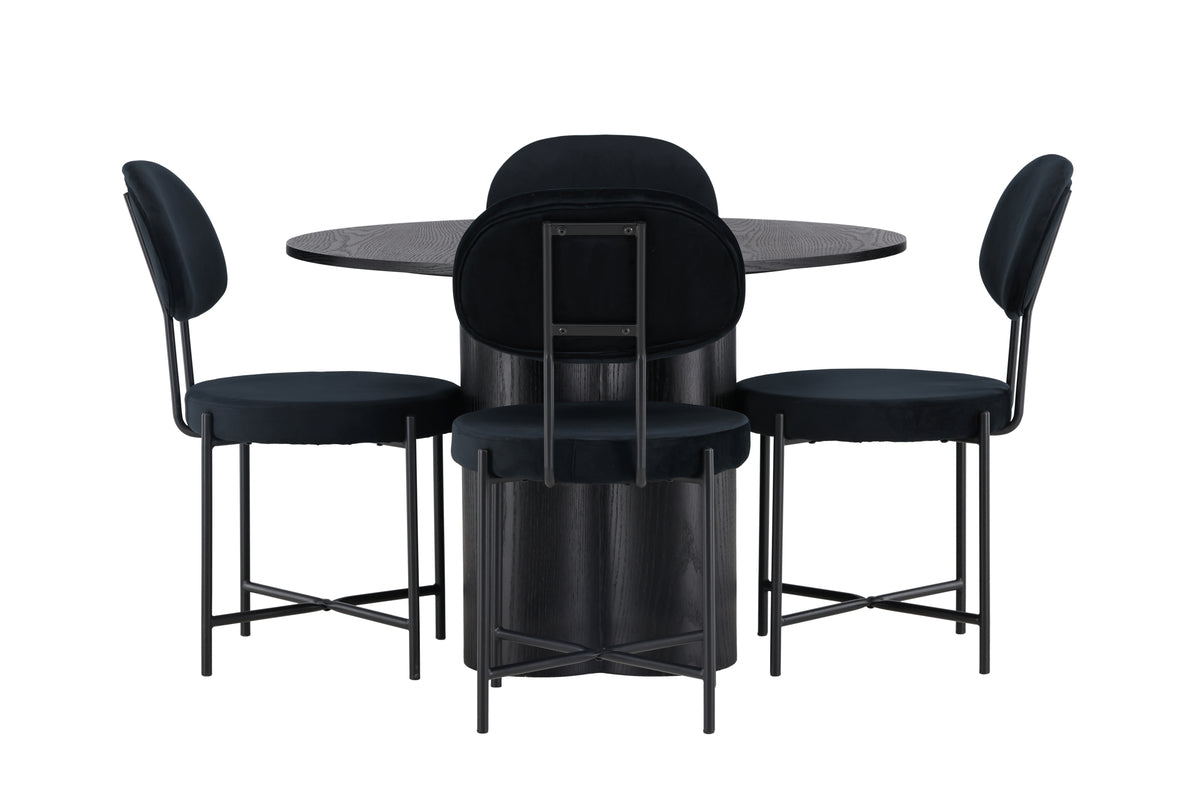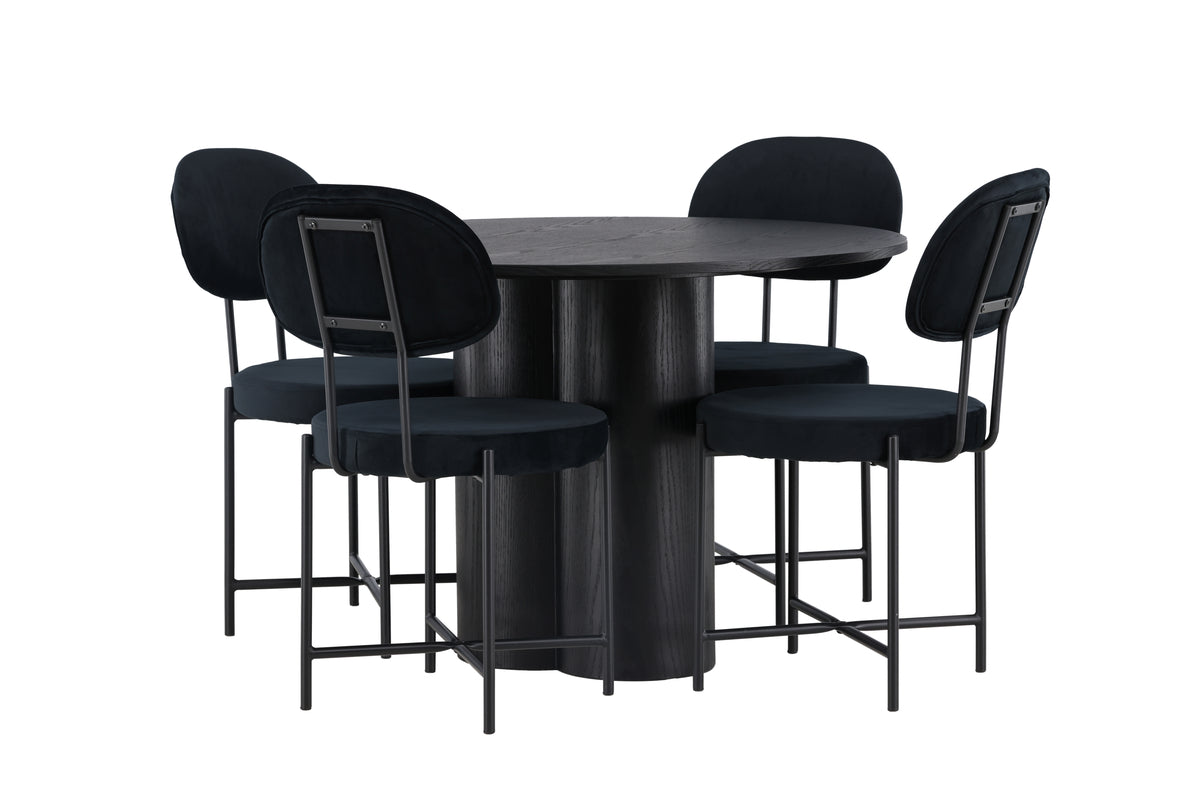 Välkommen hem till en atmosfär av elegans och stil med matgruppen Olivia och Stella. Här får du en tidlös middagsupplevelse som imponerar på både familj och vänner! Vårt runda matbord Olivia är enastående med sin Skandinaviska design och smakfulla utformning. Med en genomgående helhetsdesign i elegant svart kulör blir Olivia det perfekta valet för att ge ditt hem en modern touch. Tillverkat i hållbar MDF, har bordet en tunn, rund toppskiva som ger en elegant yta och tre cylinderformade ben, som sitter samlade under bordets mitt. Bordets mått: 110cm. Här kombineras det svarta matbordet Olivia med de trendiga matstolarna Stella för en fulländad uppsättning. Stolen är inte bara stilren, den är också otroligt bekväm. Med en trendig design blir den en perfekt följeslagare till Olivia-bordet. Stolsryggen och den runda sittsytan i svart sammetstyg ger en touch av lyx och elegans. De minimalistiska stolsbenen i svart stål kompletterar helhetsintrycket och ger stolen en modern touch. Vad mer kan man behöva? Denna matgrupp kombinerar tidlös design med komfort och funktionalitet. Varje måltid blir en trivsam upplevelse samtidigt som du skapar en inbjudande atmosfär i ditt hem – här hamnar ingen på kanten!