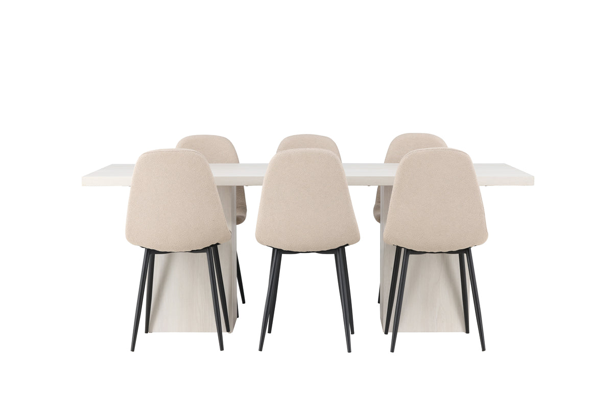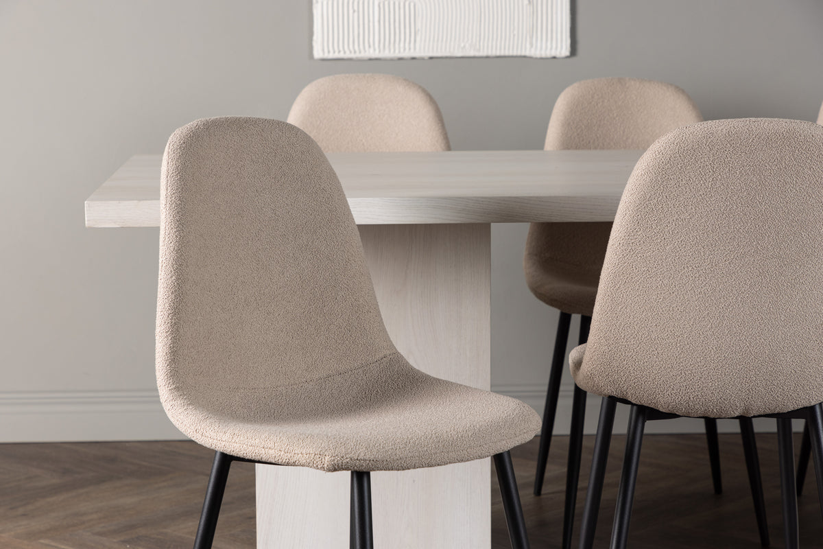 Skapa en tidlös inredning med den här stilrena matgruppen - Komfort och design i perfekt harmoni! Vårt robusta matbord Olga har en vitputsad finish och stilren skandinavisk design. Den rektangulära bordsskivan, tillverkad i MDF, utstrålar elegans och skapar en fräsch atmosfär i ditt hem. Men skönheten ligger inte bara i utseendet – det här matbordet är också praktiskt med sina två stadiga, blockformade bordsben i samma material. Bordets mått: 200x75cm. Här kompletteras matbordet på ett modernt sätt med våra klassiska matstolar från serien Polar. Polar-stolarna har en rak nordisk design och är klädda i ett vackert beige boucletyg. Den rundade ryggen och sätet är generöst stoppade, vilket ger en härlig känsla komfort. Stolarnas ben är tillverkade i svart pulverlackerad metall och ger en modern touch till den skandinaviska designen. Med matbordet Olga och stolarna Polar kan du skapa en inbjudande atmosfär där du och dina nära och kära kan njuta av långa och minnesvärda stunder vid middagsbordet. Glöm kompromisser mellan komfort och design - här får du bägge delar i en perfekt harmoni!