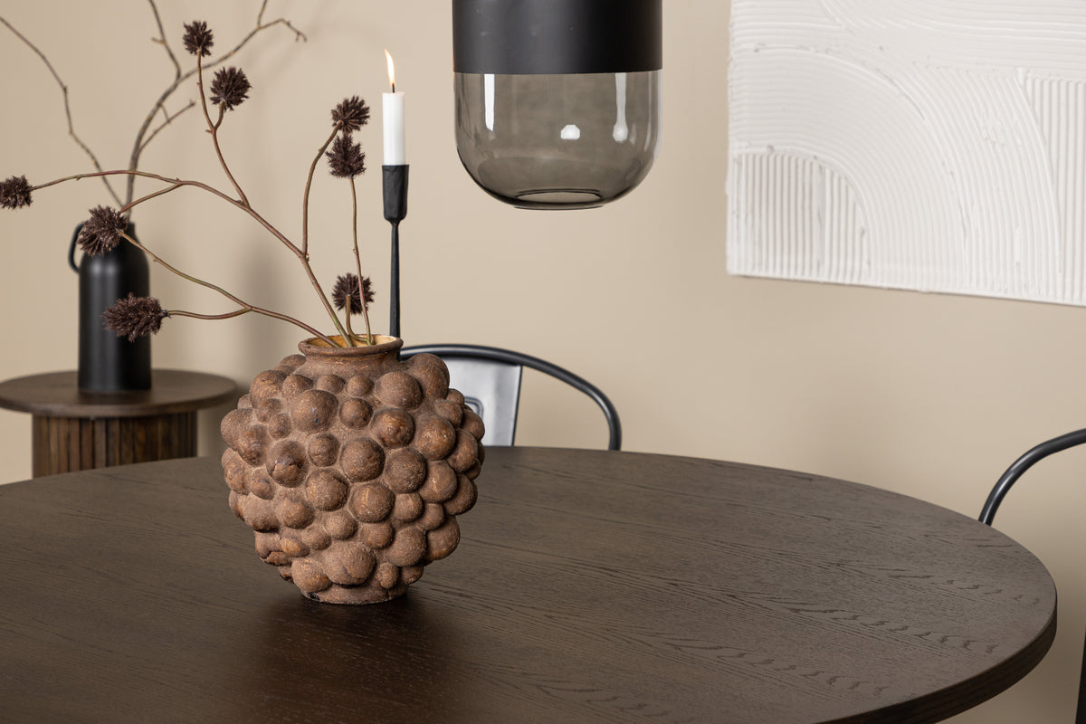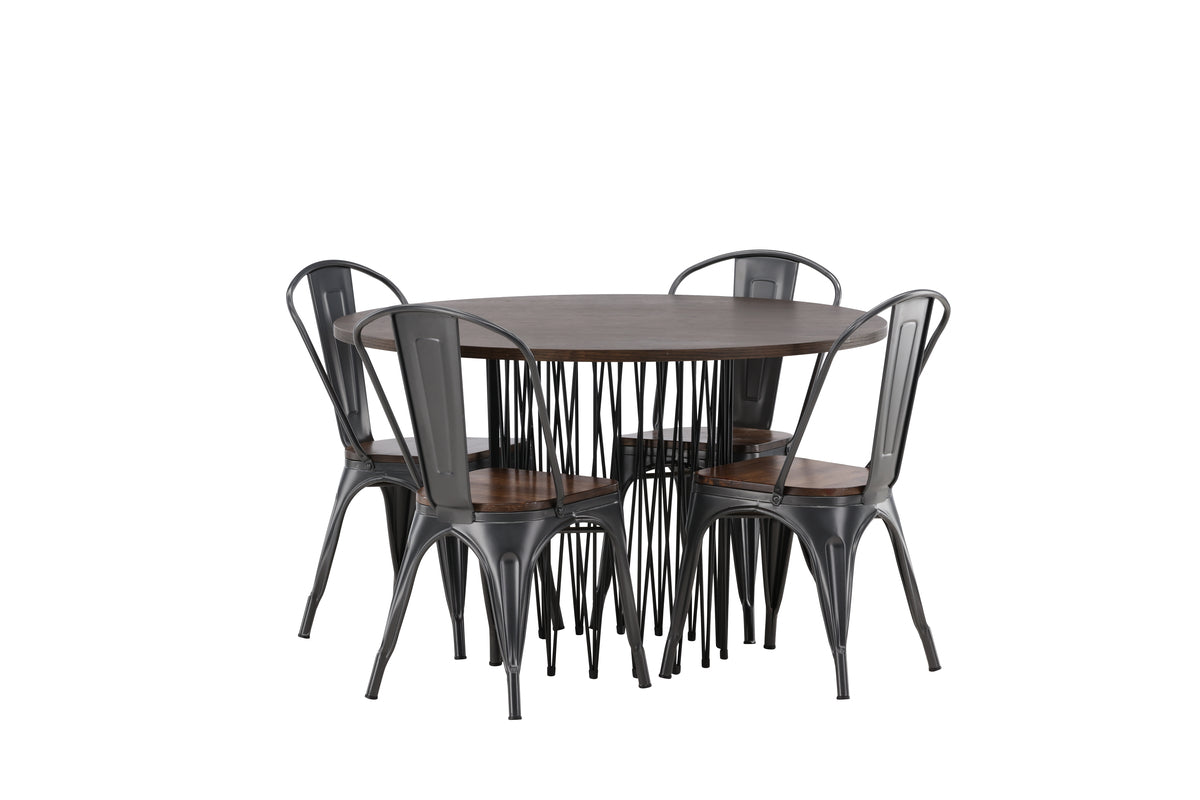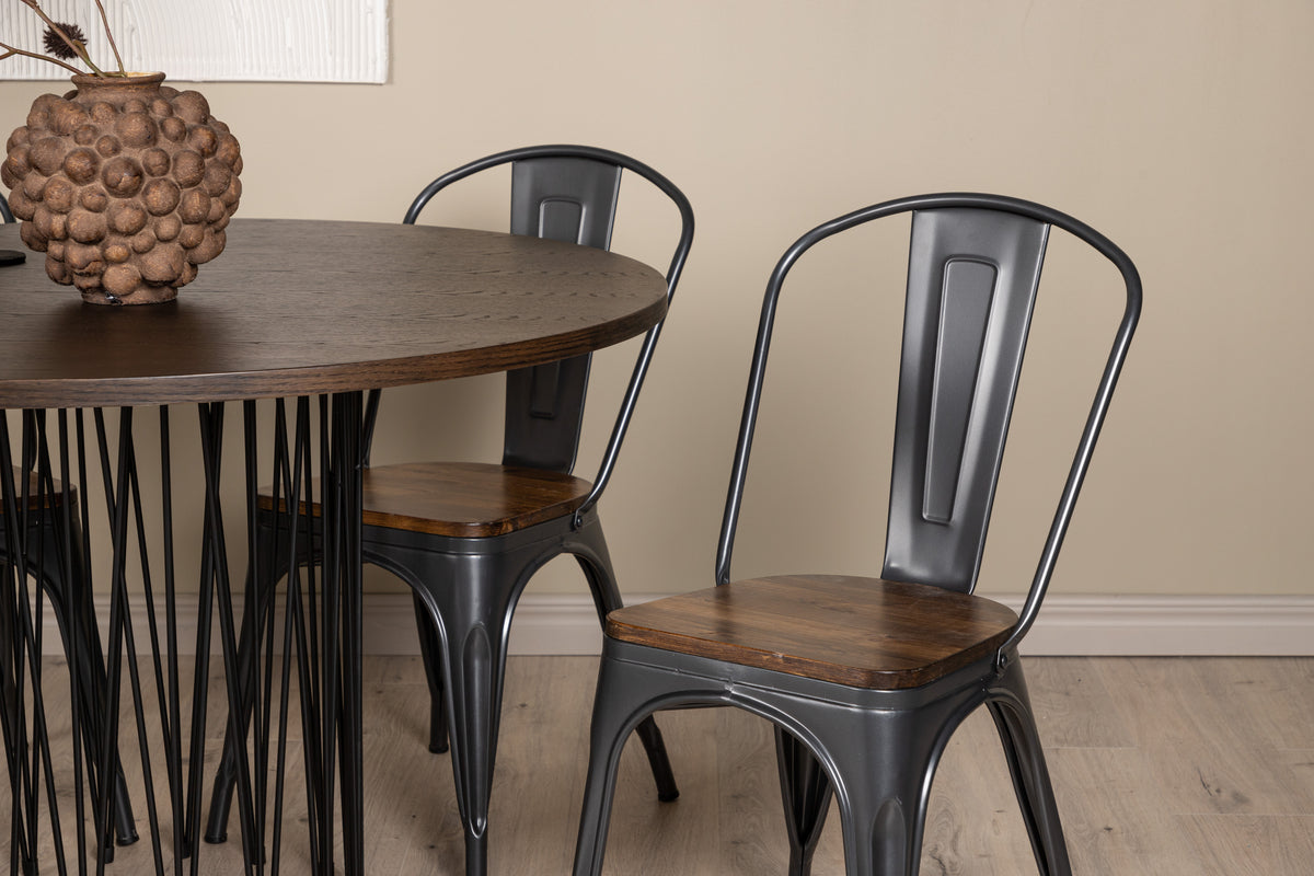 Skapa ett matchande blickfång i det moderna köket! Vårt runda matbord Stone har en läcker Skandinavisk design som faller många i smaken. Bordet har en vacker brunfärgad bordsskiva i MDF med faner och en dekorativ cylinderformad stomme i svart metall. Här tillsammans med matstolar från serien Tempe. Stolen tillhör Venture Home kollektionen och har en klassisk design av en rustik stol med lätt utsvängda ben i mörkgrått stål och en sits i mörkt trä. Möblera smart och stilrent!