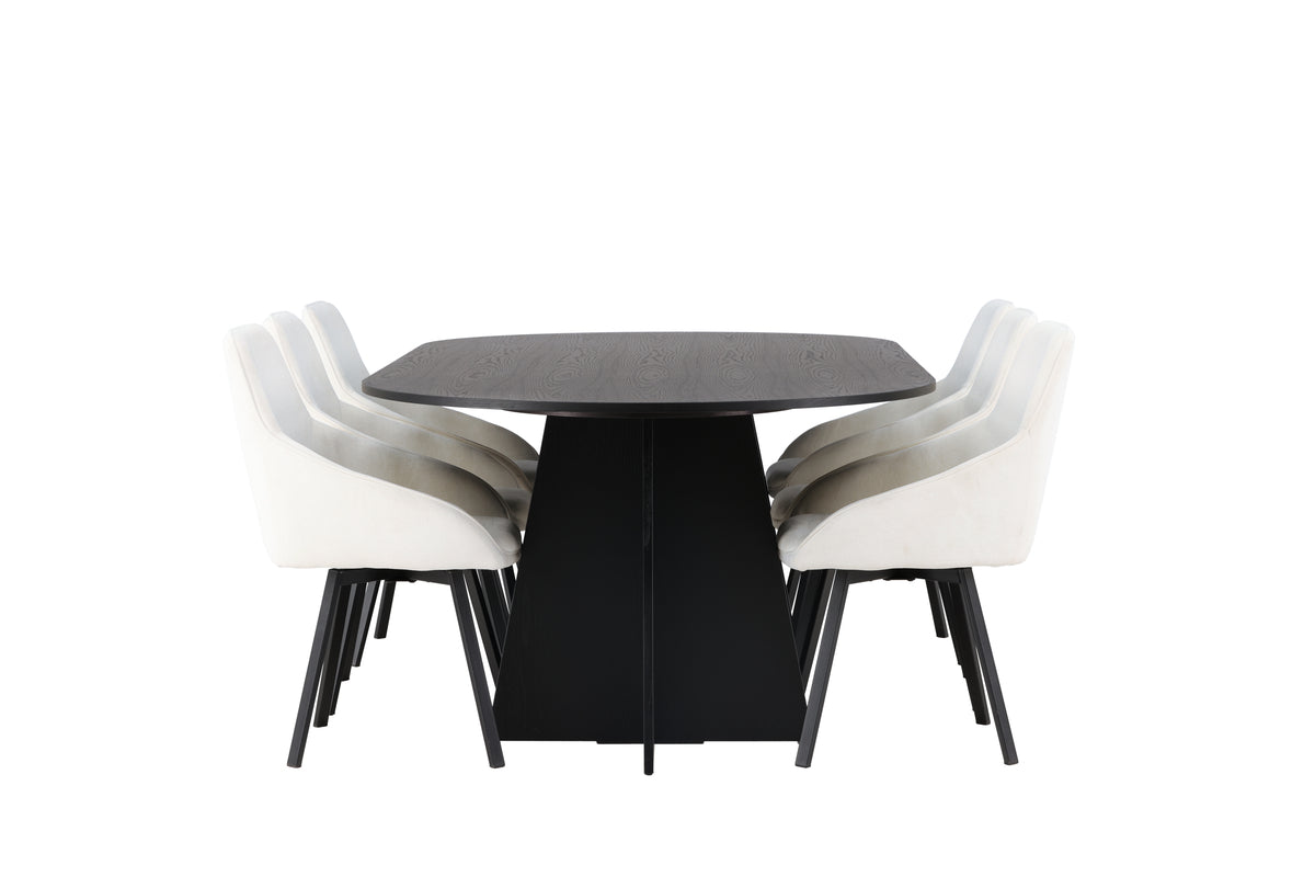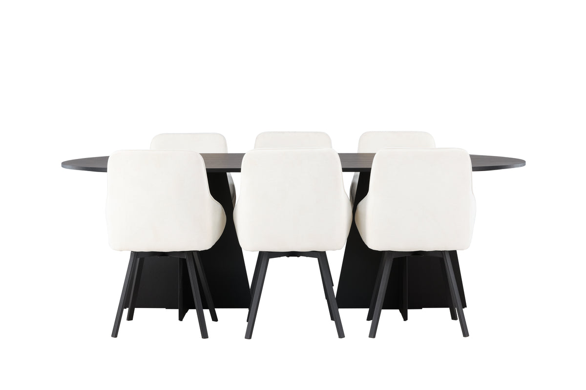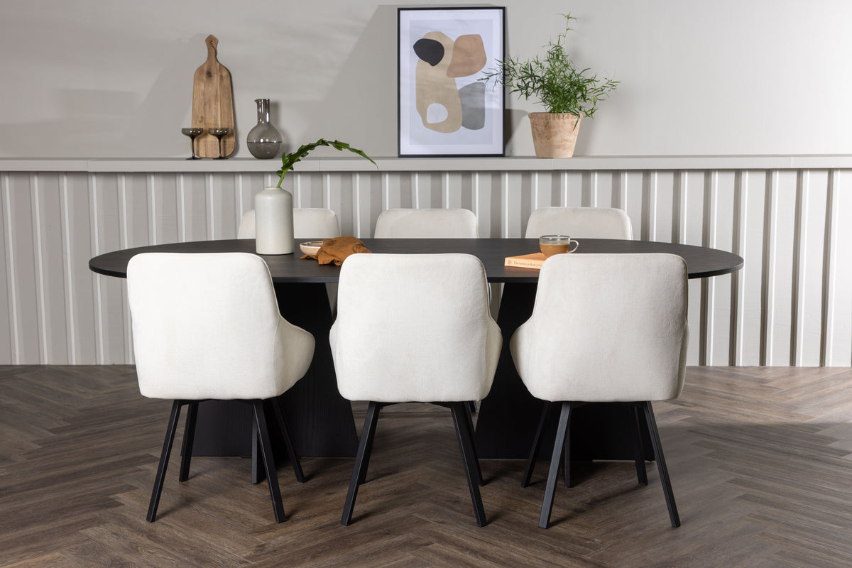 Stilrent, modernt och pampigt – den här lyxiga matgruppen i skandinavisk stil kombinerar alla våra favoritegenskaper! Vårt ovala matbord Bootcut i pampig design blir snabbt en snygg mittpunkt i hemmet. Bordsskivan är oval i svart MDF med faner och de två konformade benen har en robust design som utgör en stadig bas. Bordets mått: 115x230cm. Här har vi matchat det svarta bordet med våra populära matstolar i modern stil från serien Rosie. Dessa trendiga matstolar kombinerar komfort och stil på ett enastående sätt. Den beigea tygsitsen, som är helklädd och har integrerade armstöd, ger en känsla av lyx och bekvämlighet. De lätt utsvängda stolsbenen i svart metall ger inte bara stabilitet utan även en subtil touch av modernitet. Vad mer kan man önska? Den här matgruppen smälter samman i en härlig helhet och är enkel att matcha med övrig inredning tack vare sina tidlösa kulörer!