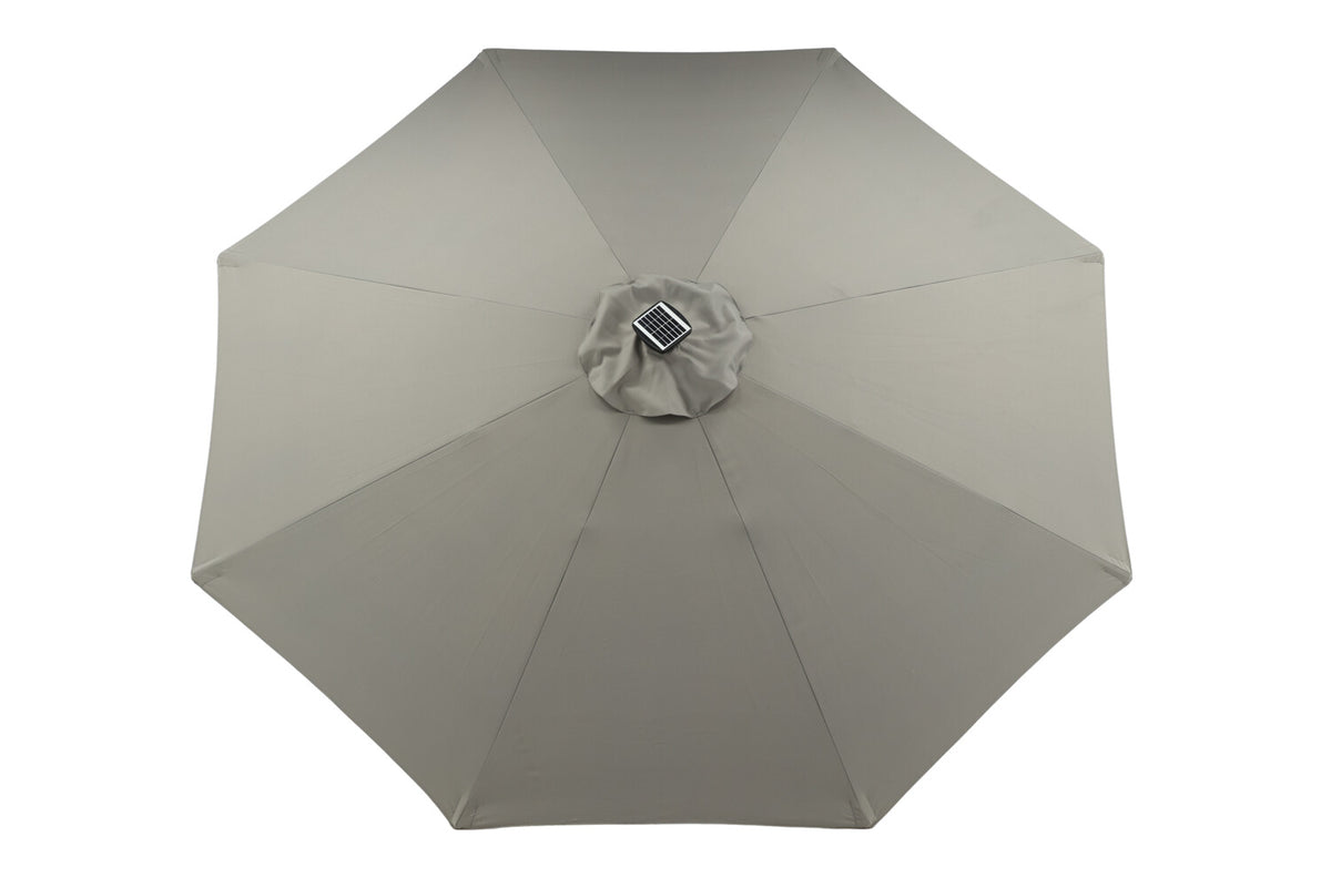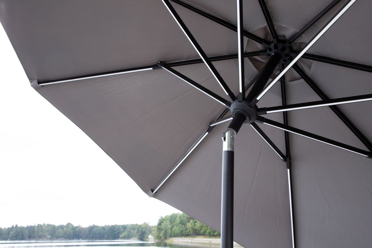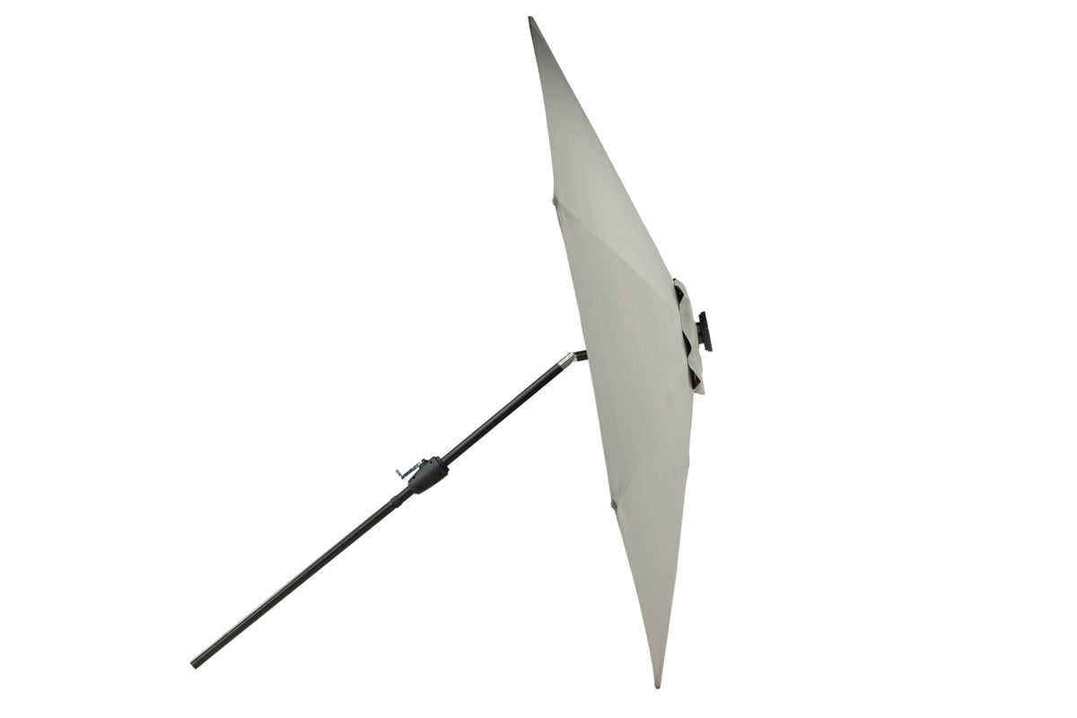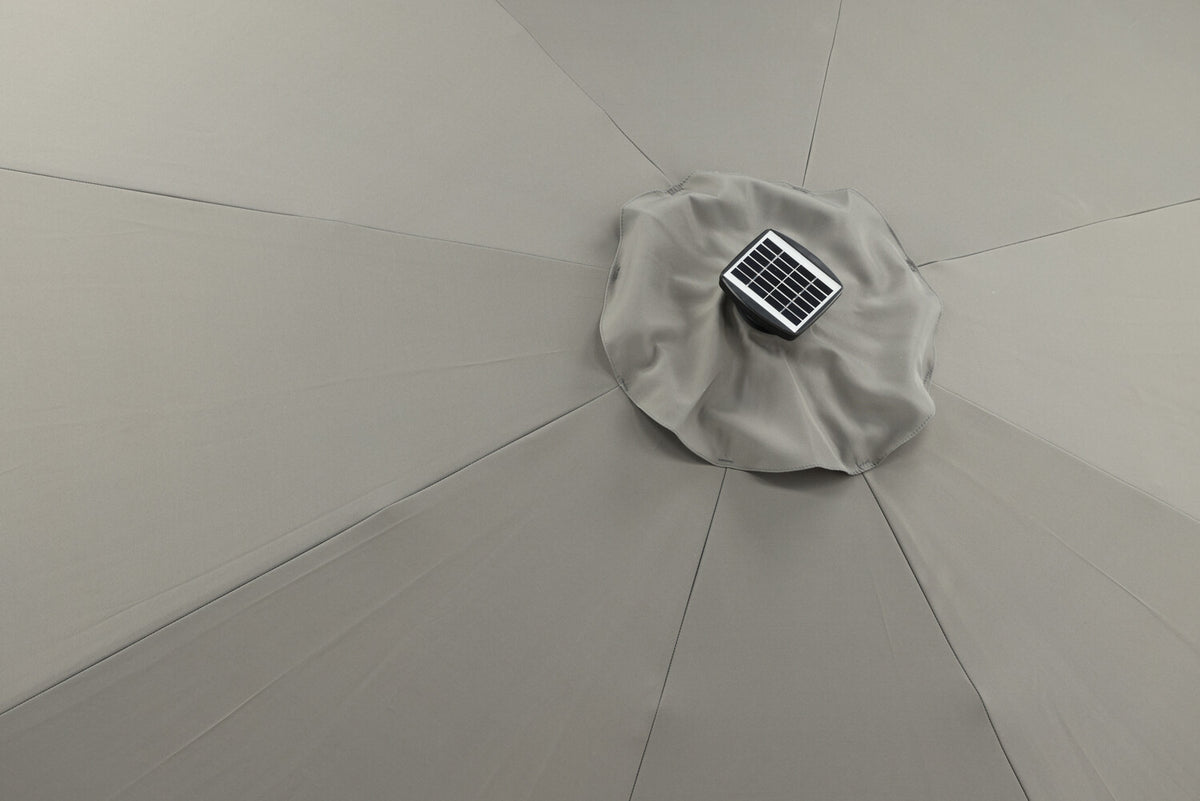 Ett fristående parasoll med grått tyg, perfekt för lata dagar i skuggan! Flytta runt det på din uteplats efter ditt behov. LED-belysningen ger ett mysigt sken på kvällarna. Mått: 270 cm Skötselråd: För våra parasoll rekommenderar vi att man använder sig av parasollskydd. Dra på överdraget när parasollet inte används, det mot sol och minskar därmed risken för solblekning. Överdraget används när parasollduken är torr, annars finns det risk för mögel. Lämna aldrig ett parasoll uppfält när det inte används. Hängparasoll är många gånger känsligare för vindar än vad traditionella parasoll (med pelaren mitt under duken) är.